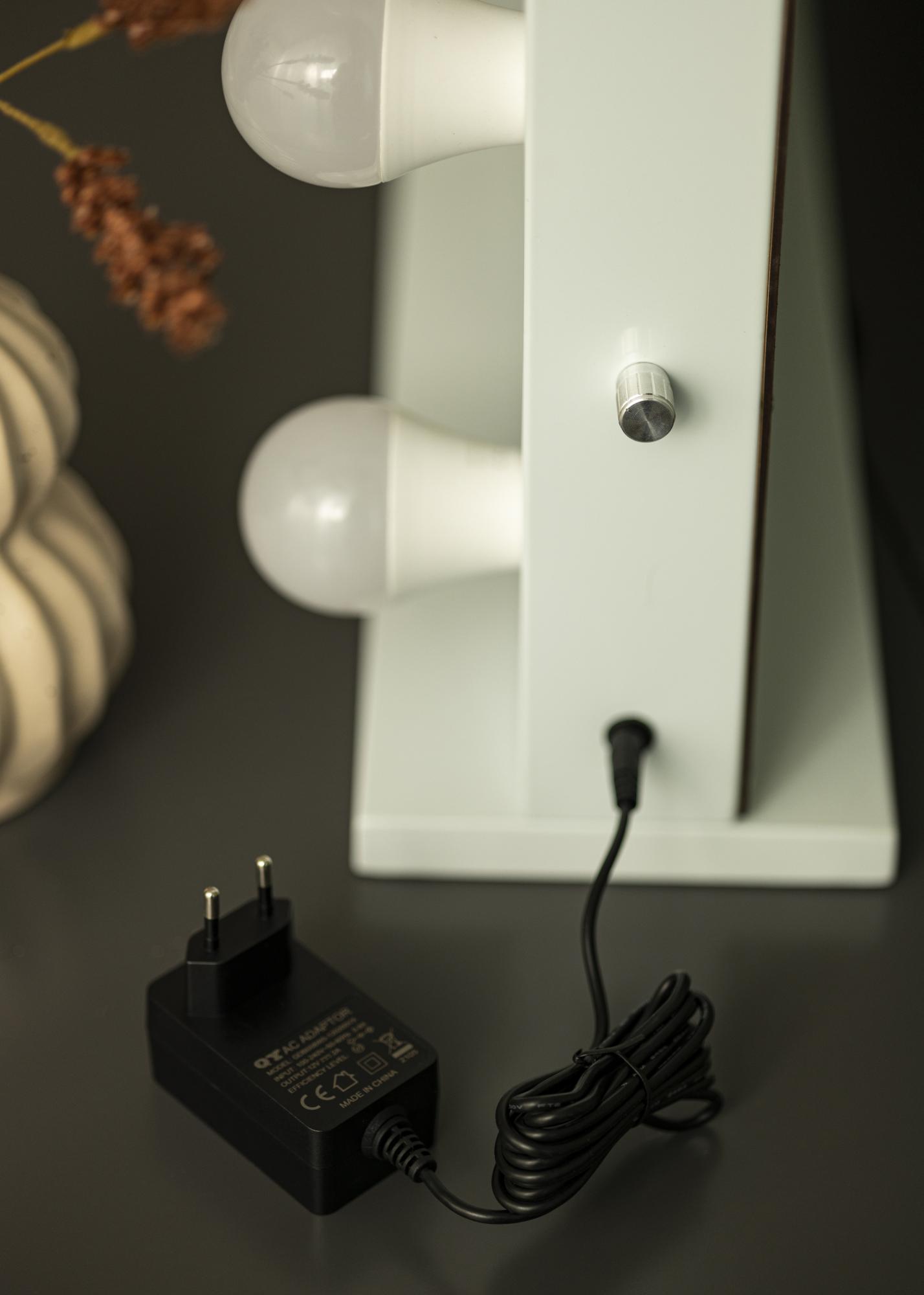 Speilets lyspærer gir et kaldt hvitt lys. Hvis du vil dimme belysningen, gjør du det ved hjelp av en praktisk dreieknapp på den ene kortsiden. Speilet kobles til strøm via stikkontakt.