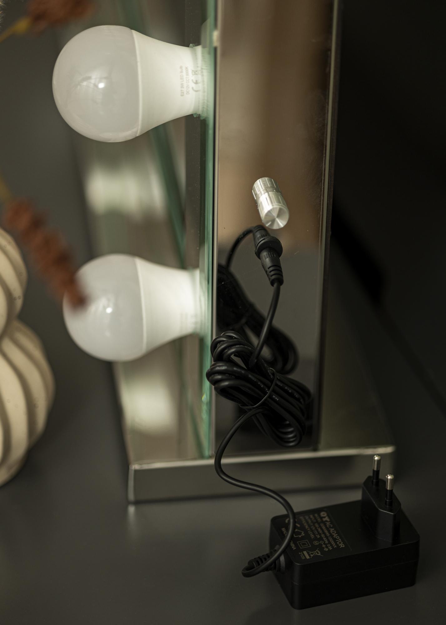 Forgyll hjemmet ditt med dette sminkespeilet med Hollywood-design. Speilet har en sølvfarget ramme som er prydet med 14 lyspærer, noe som gir speilet et herlig luksuriøst uttrykk. Lyspærene er utskiftbare og er av typen E27. Lyspærene gir et kaldt hvitt lys. Hvis du vil, kan du velge å dimme belysningen til den lysstyrken som passer best - en lys belysning passer utmerket når du sminker deg, mens et mer dimmet lys er bedre som bakgrunnsbelysning. Denne justeringen gjøres enkelt via en liten dreieknapp på kortsiden av speilet.