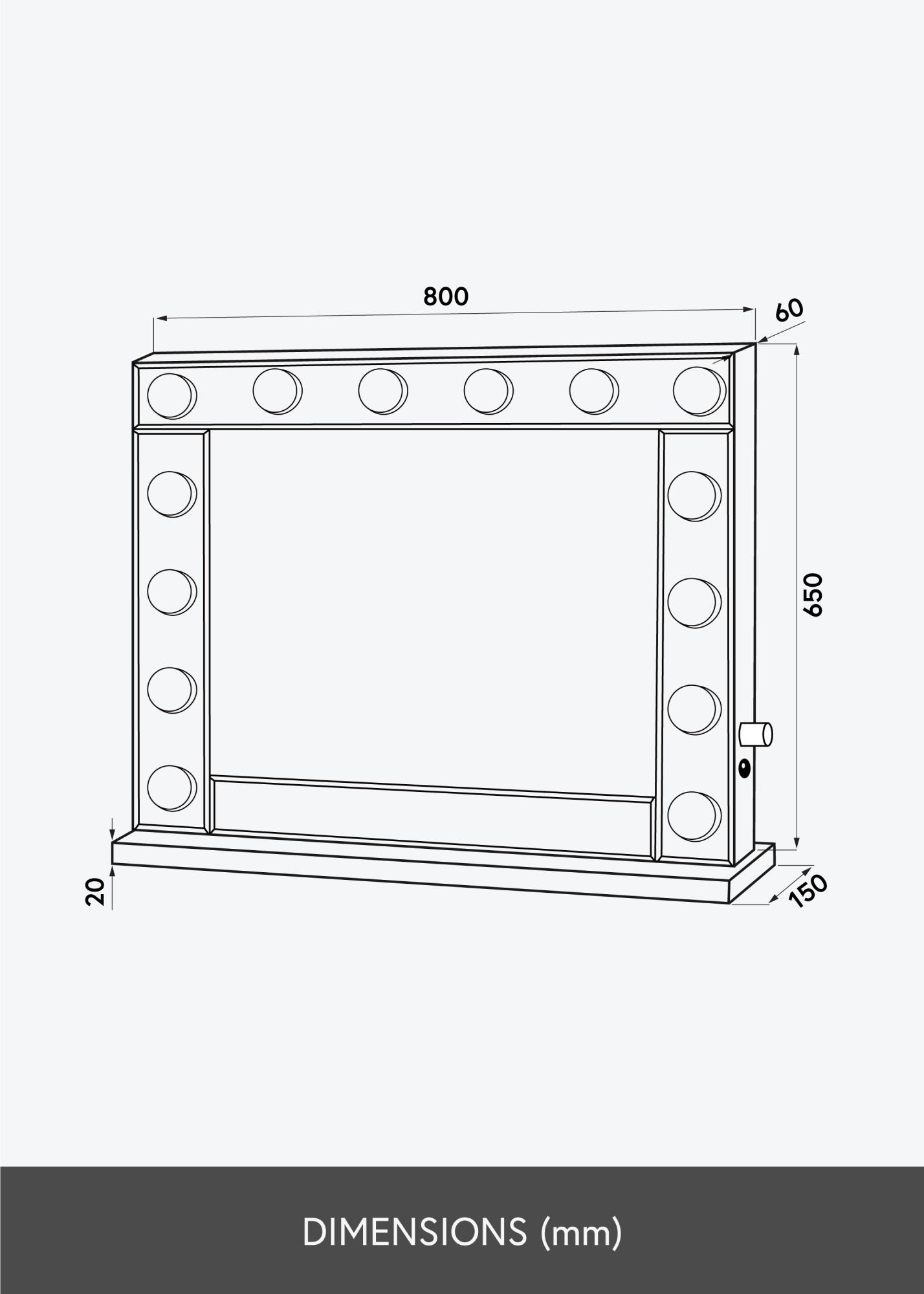 Speilet har et stort format, med en 80x65 cm stor speilflate. Fotstativet kan tas av og på, slik at du selv kan velge om du vil ha speilet stående eller opphengt på veggen. Speilet kobles til strøm via stikkontakt.