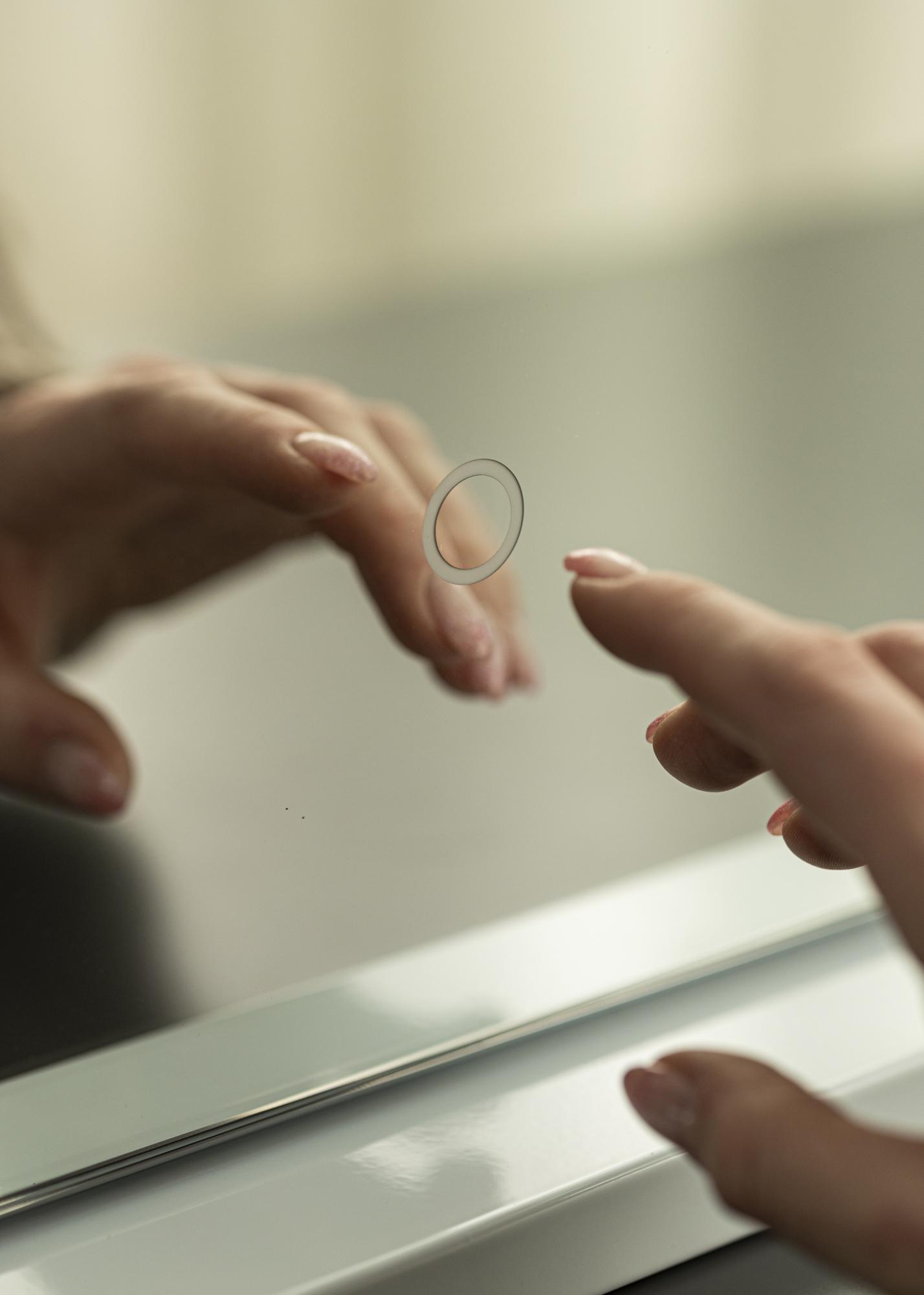 Speilets LED-belysning gir ett kaldt hvitt lys. Du slår på belysningen ved å trykke på knappen på speilflaten og hvis du holder på knappen i noen sekunder, kan du dimme lyset til ønsket styrke. Det gjør at du på en enkel måte kan velge om du vil ha en mild bakgrunnsbelysning, eller et sterkere lys som hjelper deg med å fokusere når du sminker deg.