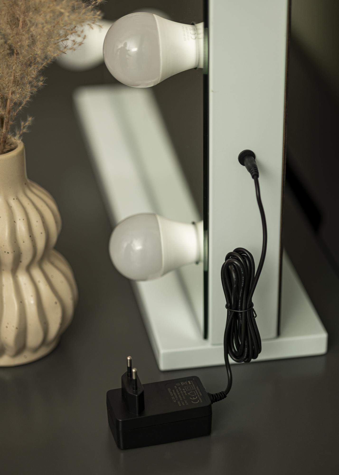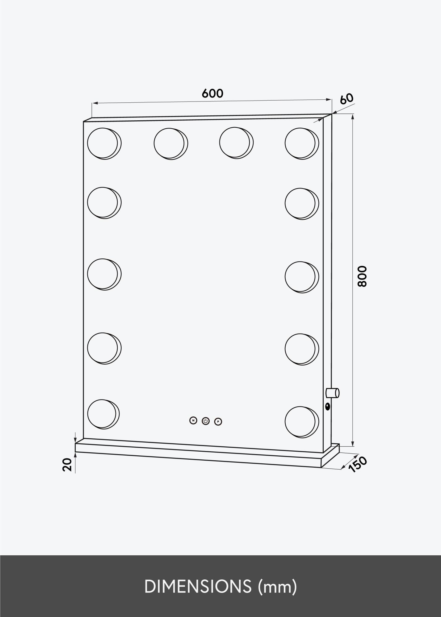 Dette er et sminkespeil i Hollywood-stil, med en klassisk rektangulær form, stor speilflate på 80x60 cm, og 14 LED-lyspærer plassert som en elegant ramme. Det kan settes stående på et møbel, for eksempel som funksjonelt speil på sminkebordet eller som en dekorativ interiørdetalj på et sidebord. Hvis du heller vil henge opp speilet på veggen ved hjelp av veggfestene på baksiden, går det fint å ta av fotstativet. Speilet kobles til strøm med stikkontakt.