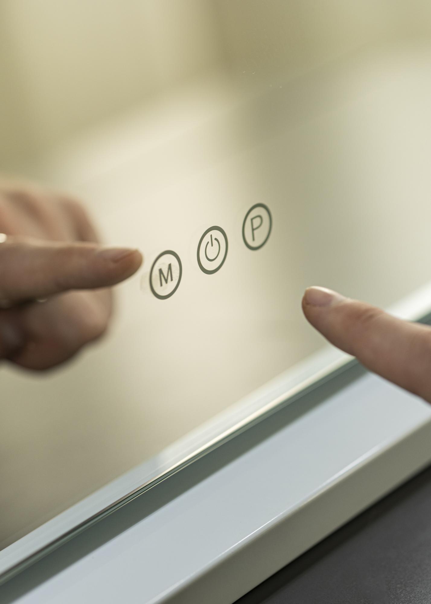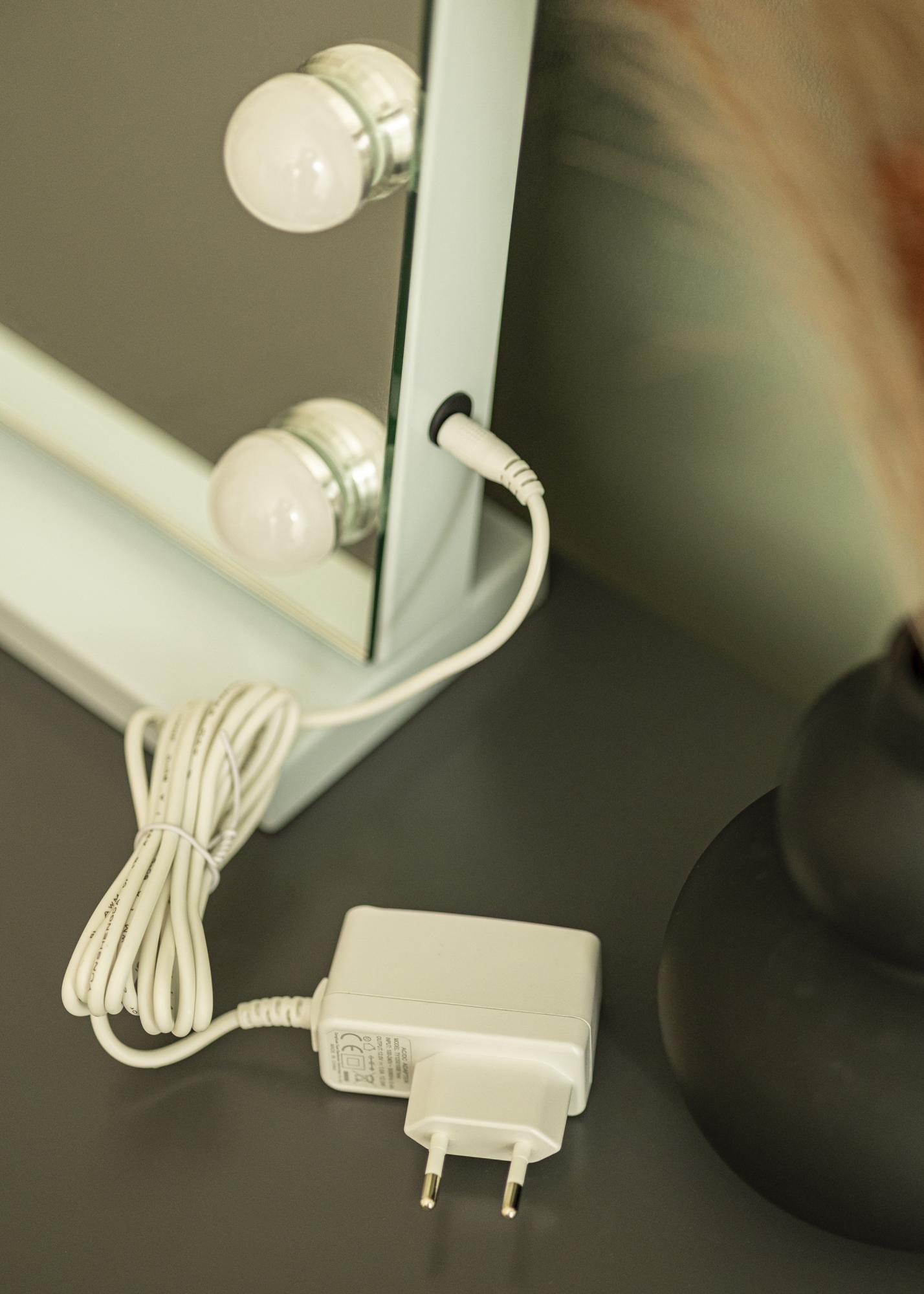 Speilet kan enten henges opp loddrett på veggen, eller settes fast på det tilhørende fotstativet. Denne modellen har en stilren hvit fot som gjør speilets utseende enda mer elegant. Du kobler til strømmen i stikkontakten.