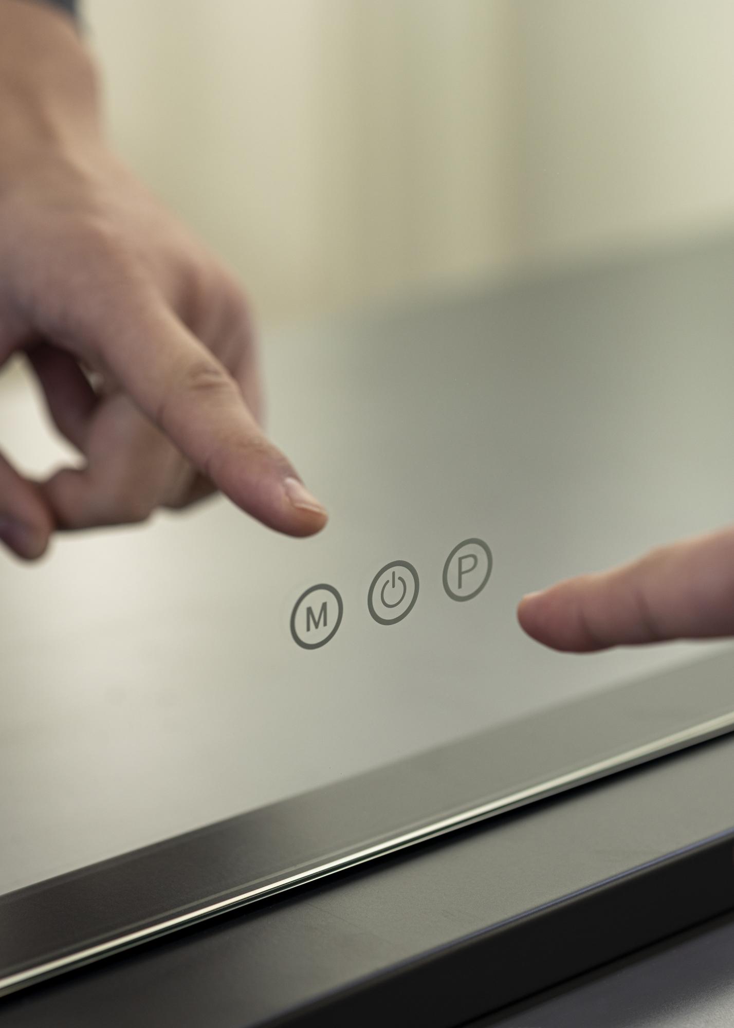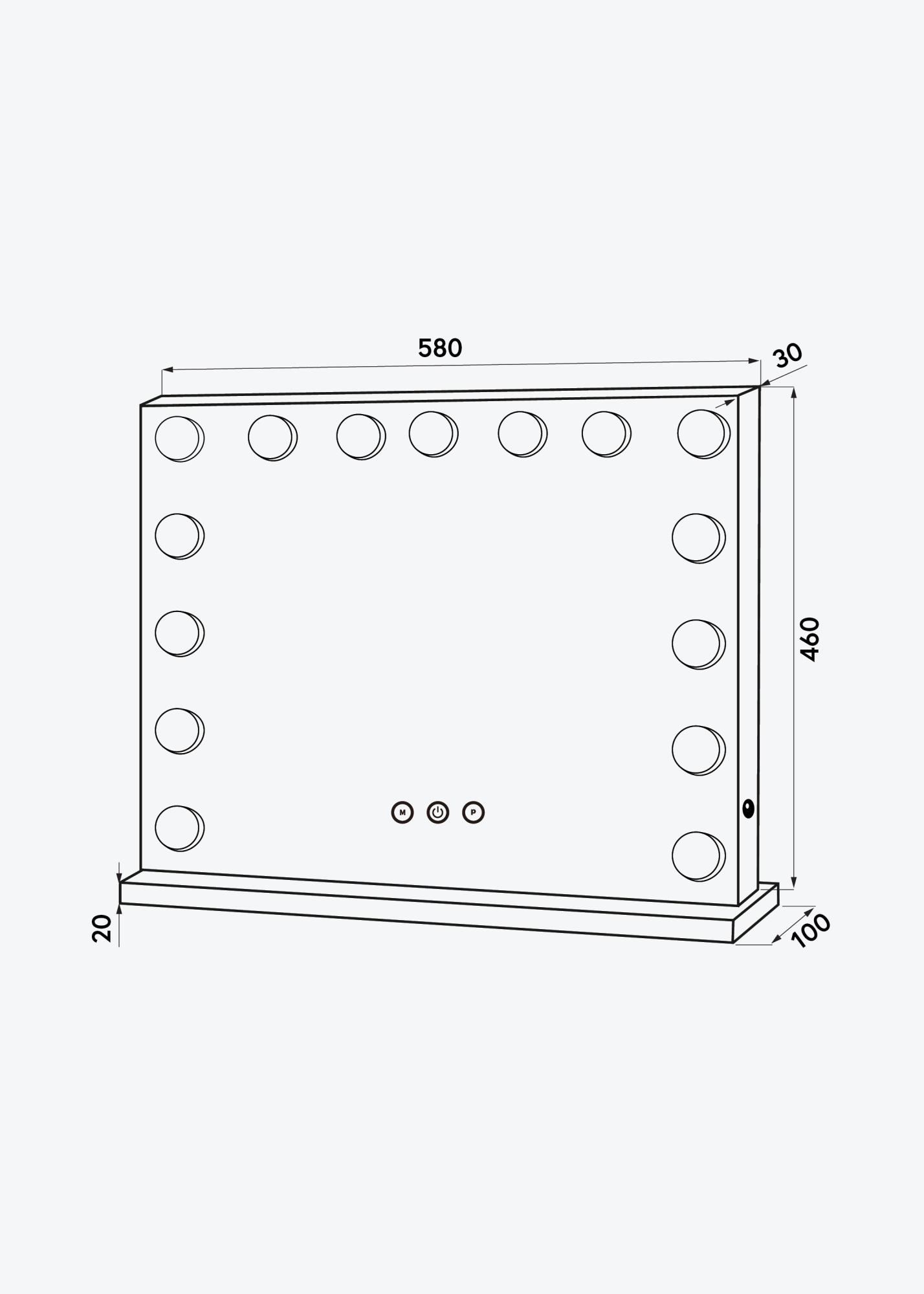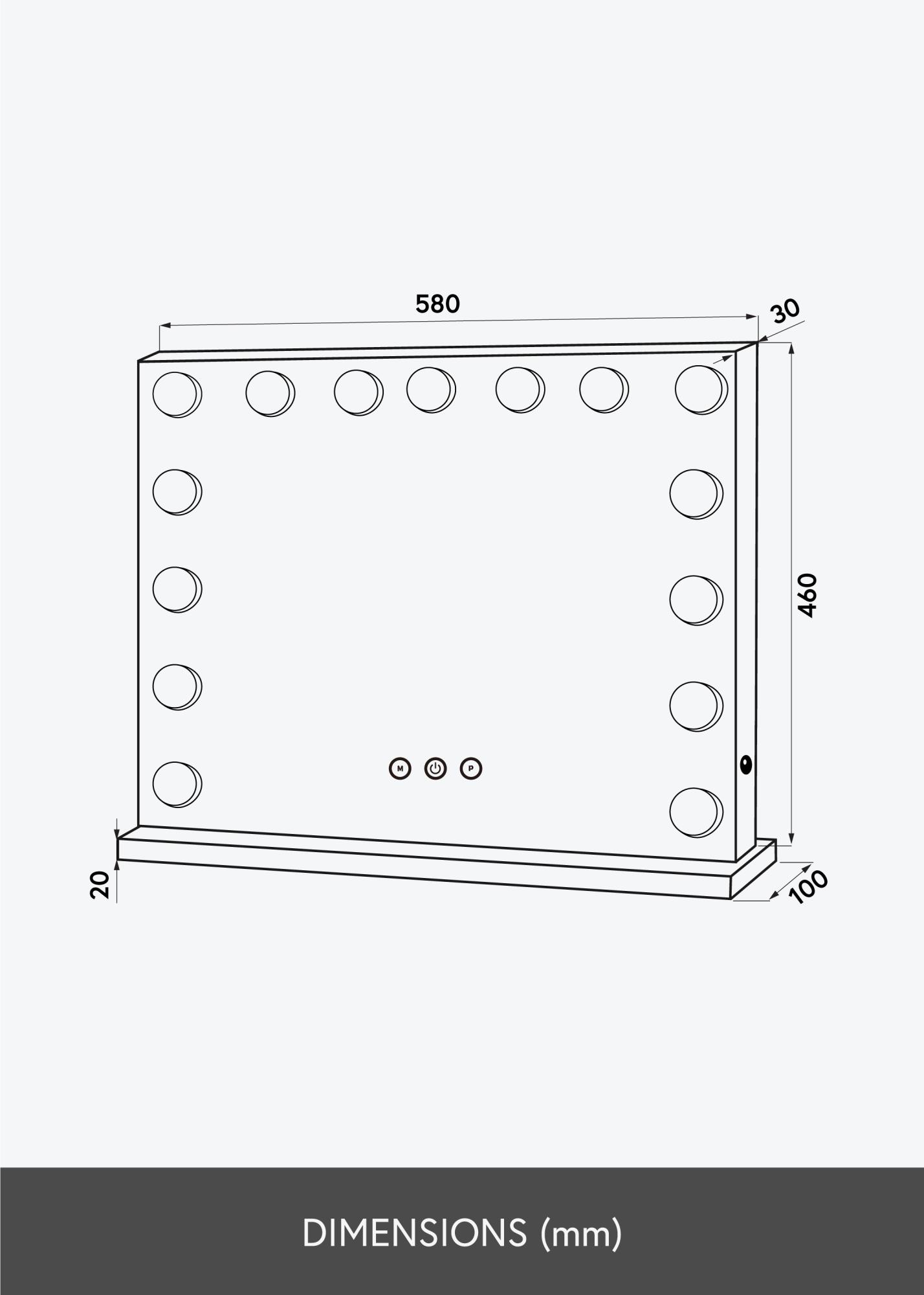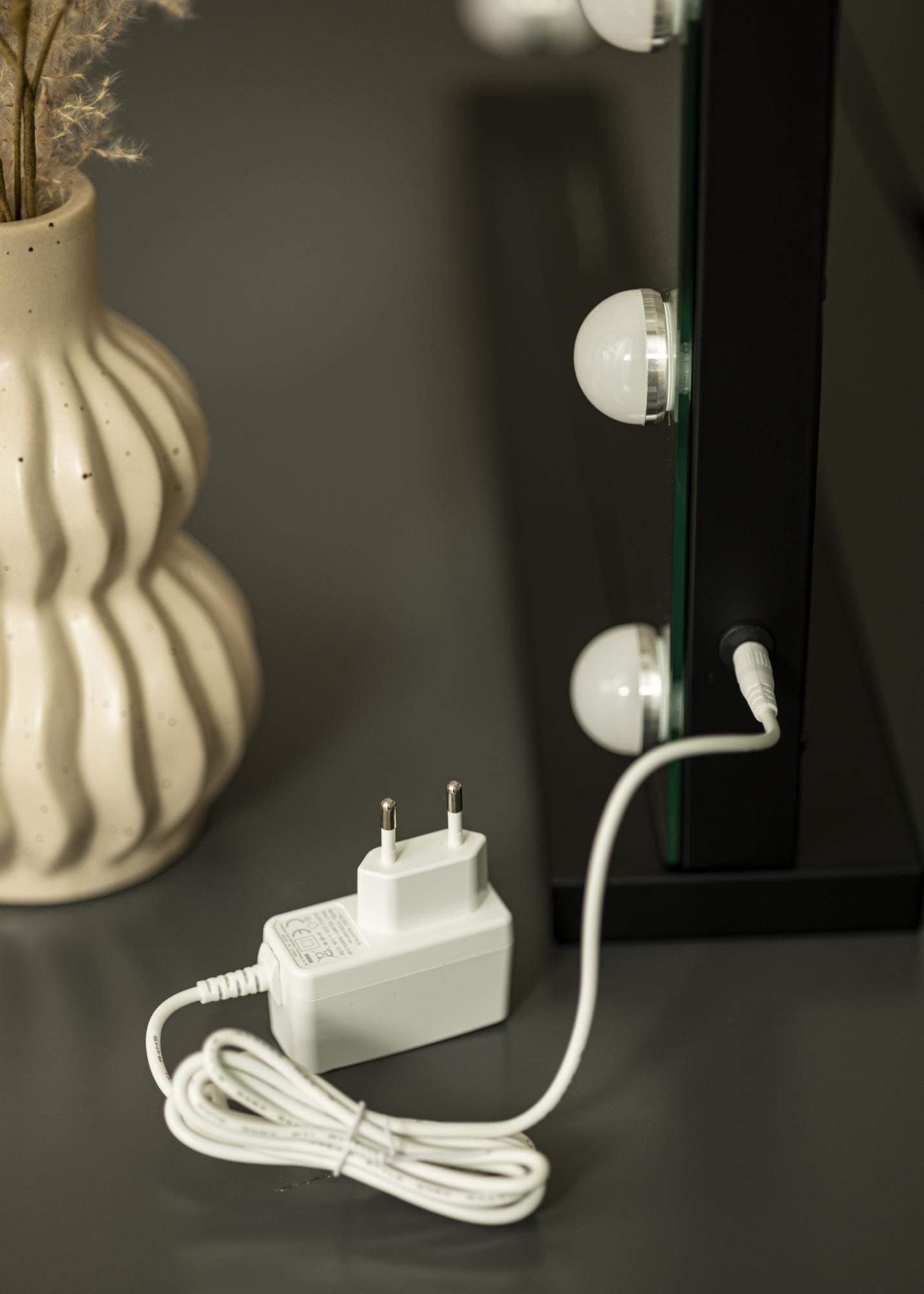 Piff opp sminkehjørnet, stua eller gangen med et elegant sminkespeil med innebygd belysning! Speilet har ingen tradisjonell ramme, men speilflaten rammes isteden inn av 15 LED-lyspærer som er plassert langs speilkantene. Belysningen er justerbar, og du kan stille inn både lysstyrke og fargetemperatur. Lysinnstillingene gjøres med touch-knappene i speilets nedre kant, der "P"-knappen endrer lysstyrke og "M"-knappen justerer fargetemperatur. Det er også en touch-knapp til å slå av og på belysningen med. Strømmen kobles til i stikkontakt.
