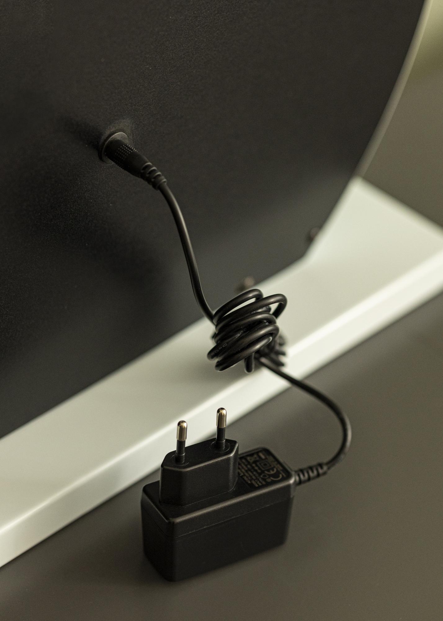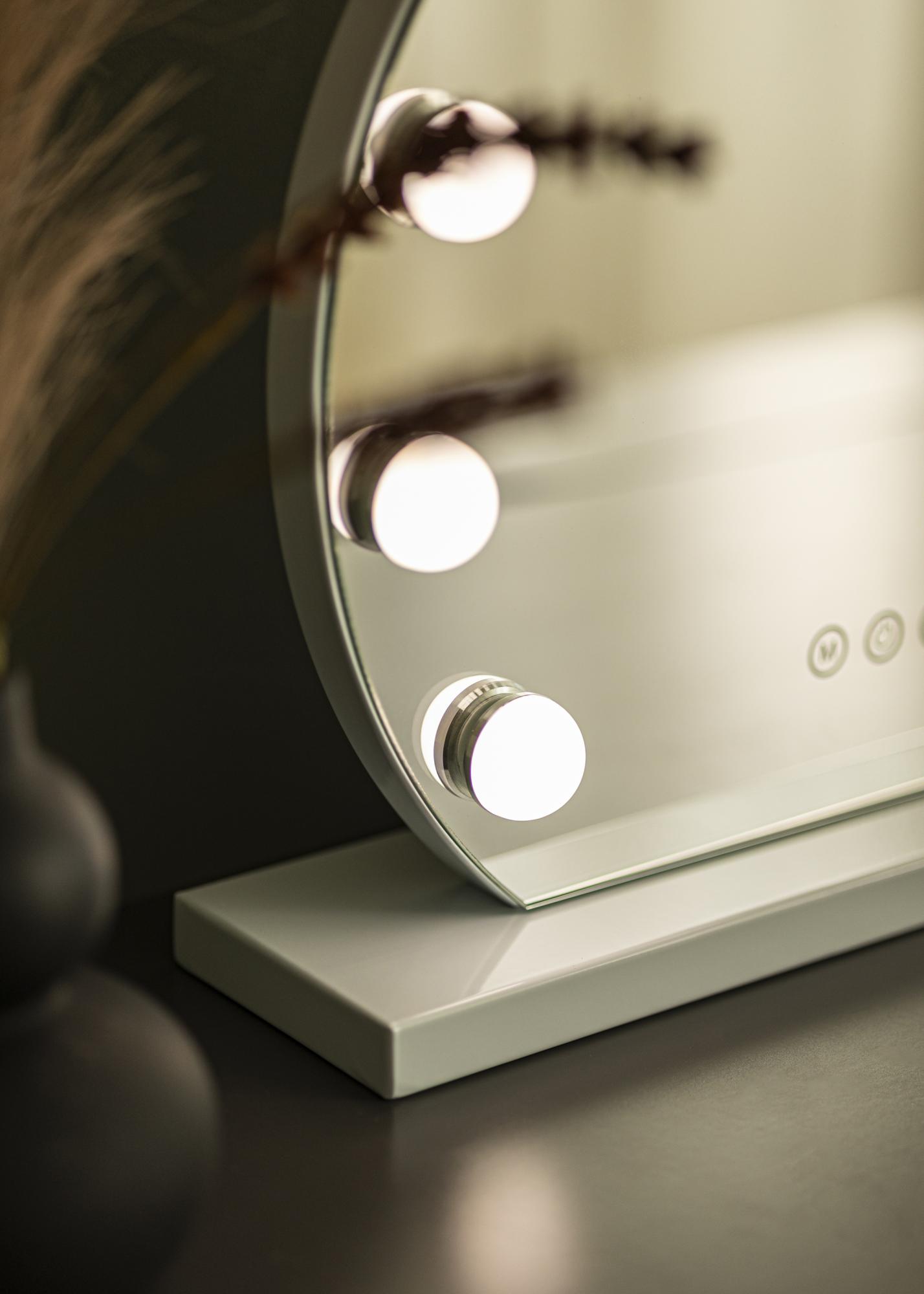 Dette er et luksuriøst sminkespeil med innebygd LED-belysning som gir jevnt lys på ansiktet når du speiler deg. Belysningen består av 10 LED-lyspærer som er plassert langs speilflatens kant. Lyset kan justeres etter din egen smak, siden du har mulighet til å stille inn både lysstyrke og fargetemperatur. Lysinnstillingene gjøres via touch-knappene på speilflatens nedre kant, og er markert med bokstaver. På knappen markert med "M" kan du velge fargetemperatur med varmt, kaldt og naturlig lys. Knappen markert med "P" brukes til å dimme lyset. Det er også en av-/på-knapp som brukes til å slå av eller på belysningen med. Strømtilkobling gjøres med stikkontakt.