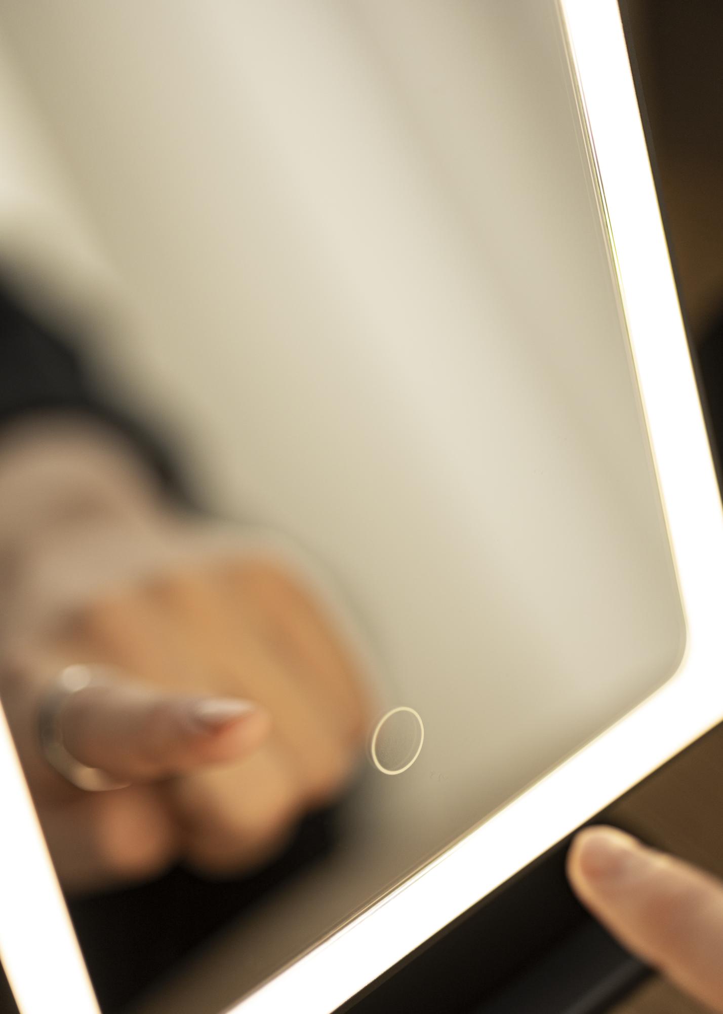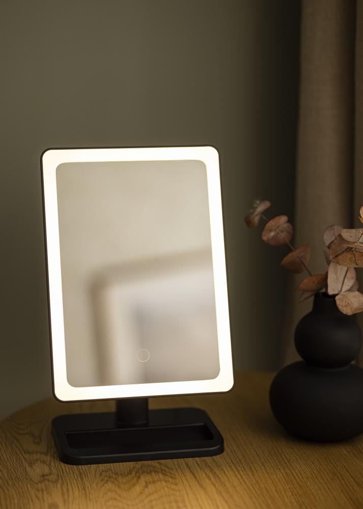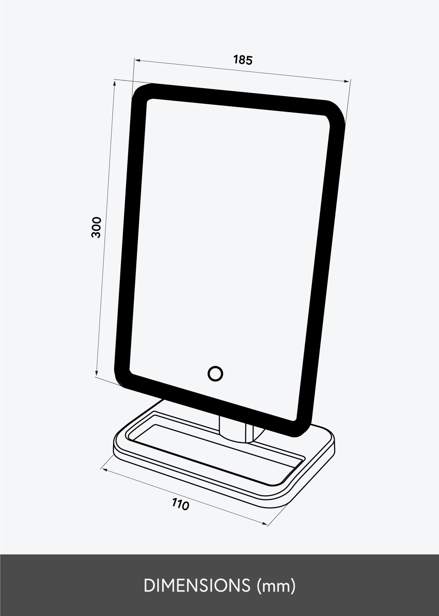 Speilet har smart design med finesser som gjør det lettere å sminke seg med utmerket resultat. Speilflaten rammes inn av en LED-lyssløyfe som lyser opp ansiktet ditt – og i tillegg kan den vris og vinkles for at du skal kunne stille inn en vinkel som passer for deg. Du kan dimme belysningen ved å trykke på knappen på speilet. Det følger også med et lite speil med 10x zoom, som passer perfekt når du vil fokusere på en liten del av ansiktet. Speilet drives av et innebygd batteri som lades opp med USB-kabelen som følger med.