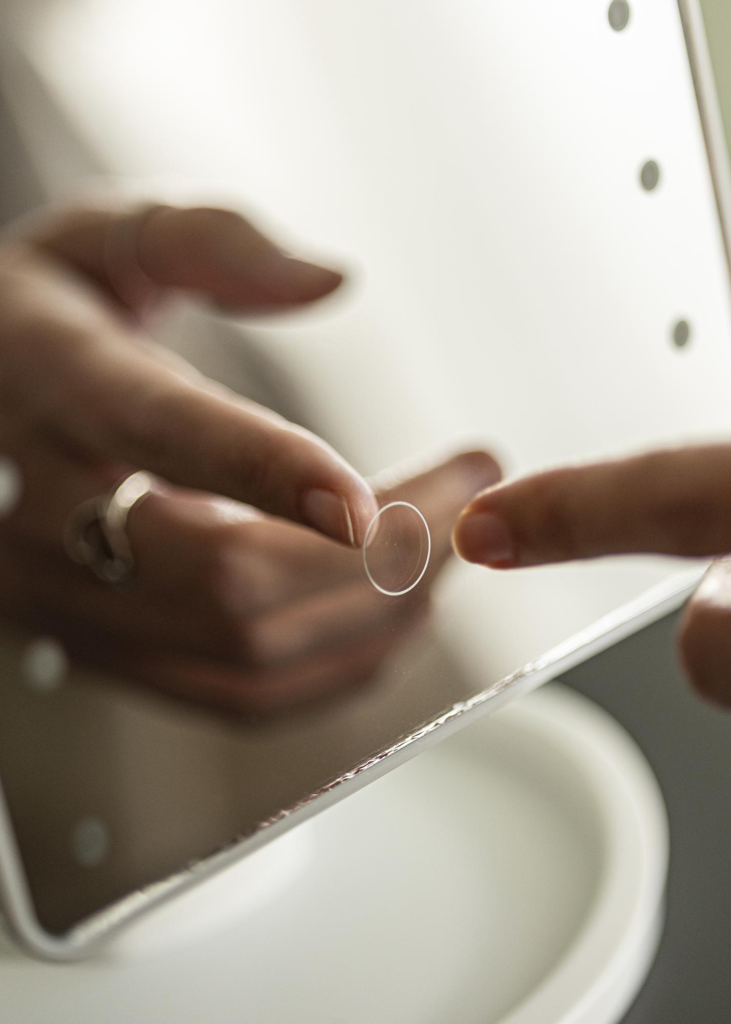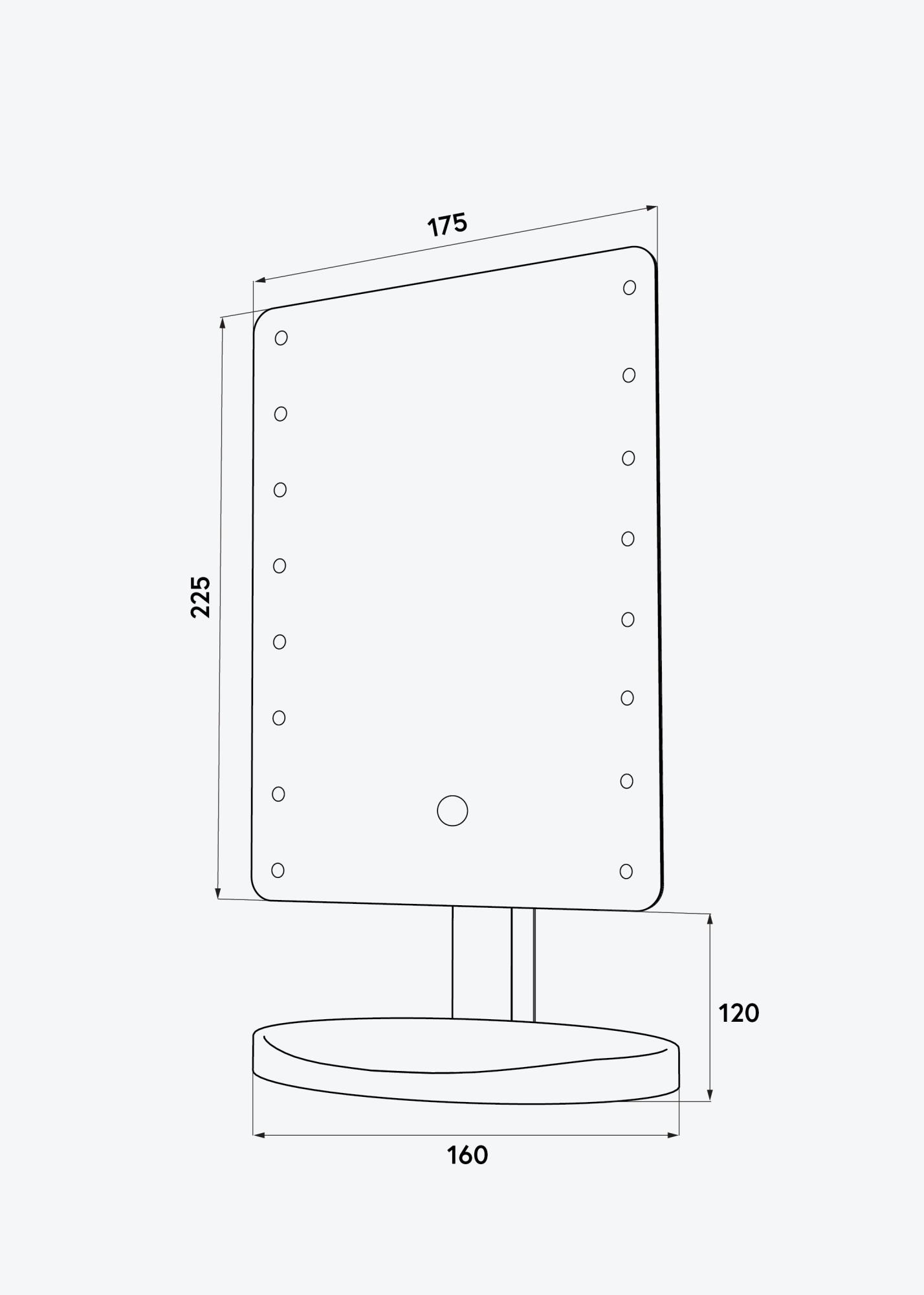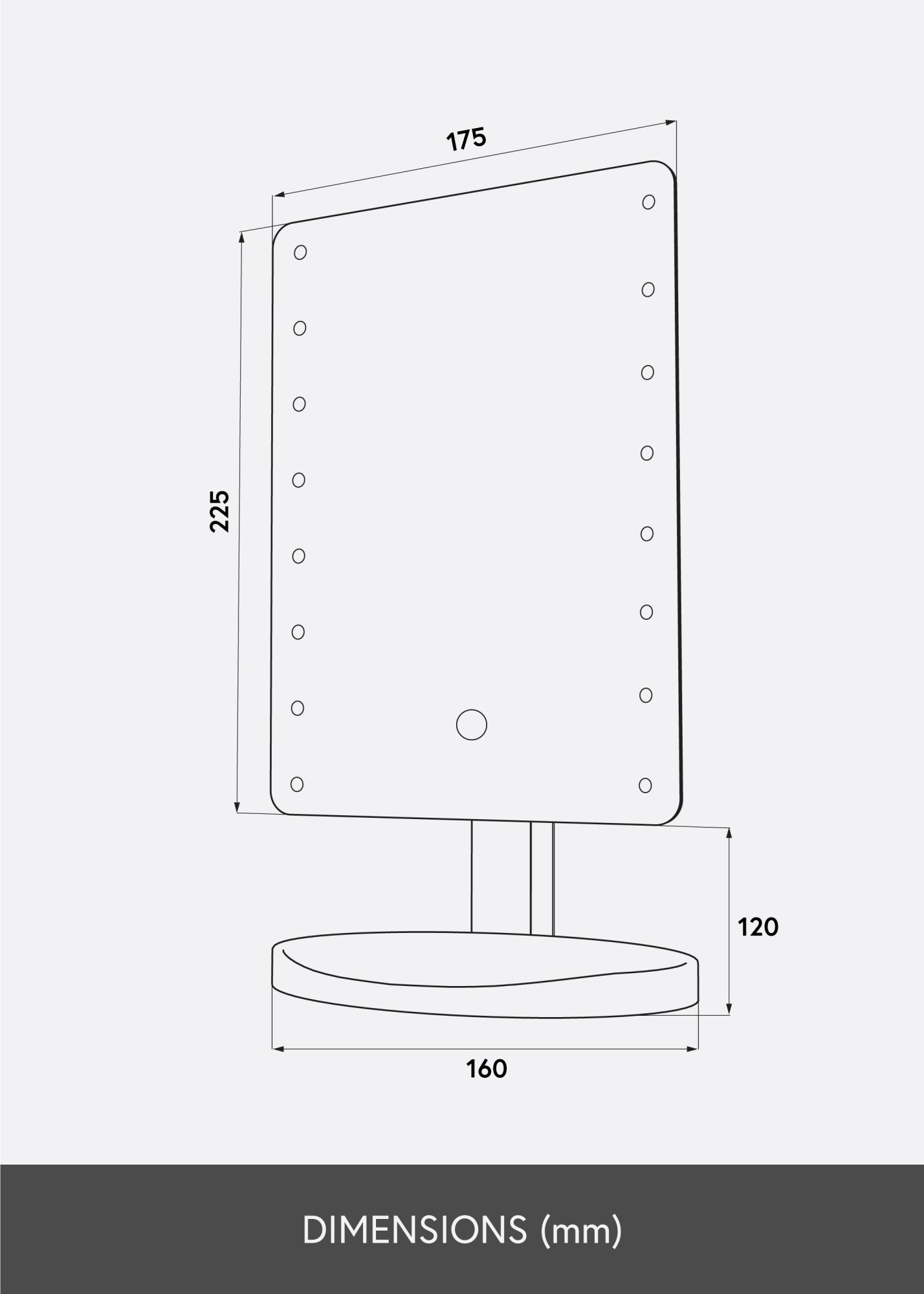 Dette er et stilig sminkespeil som er perfekt å bruke både hjemme og når du er ute og reiser. Det er veldig lett å ta med seg, med et lite format med en speilflate på 22,5x17,5 cm, og et materiale av lett kompositt. Speilet kan vinkles og vris slik at det blir horisontalt.