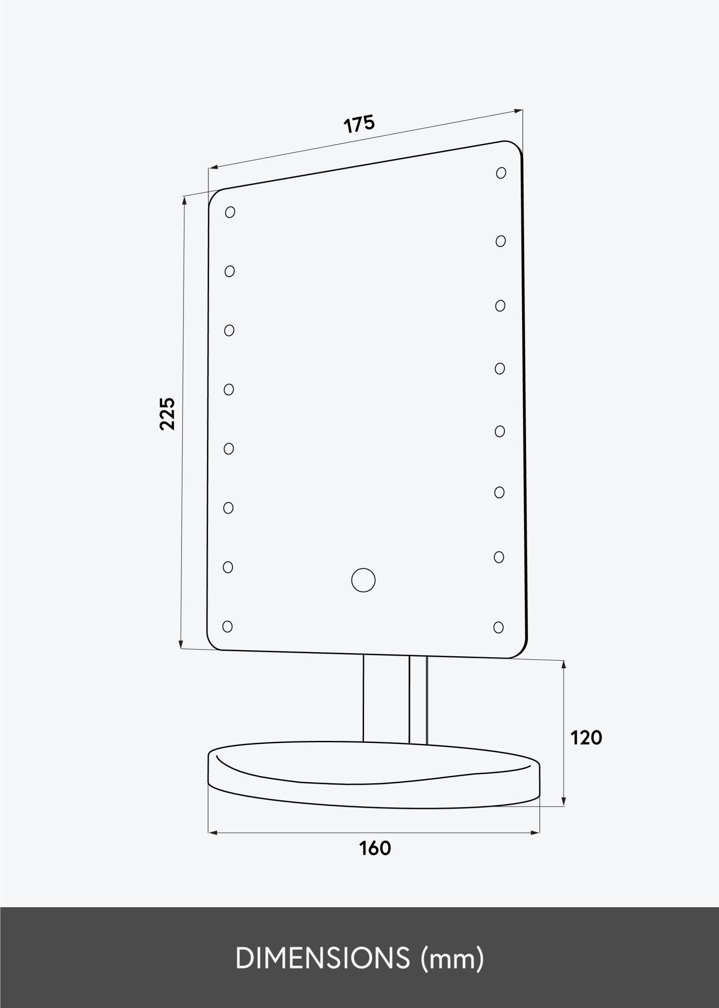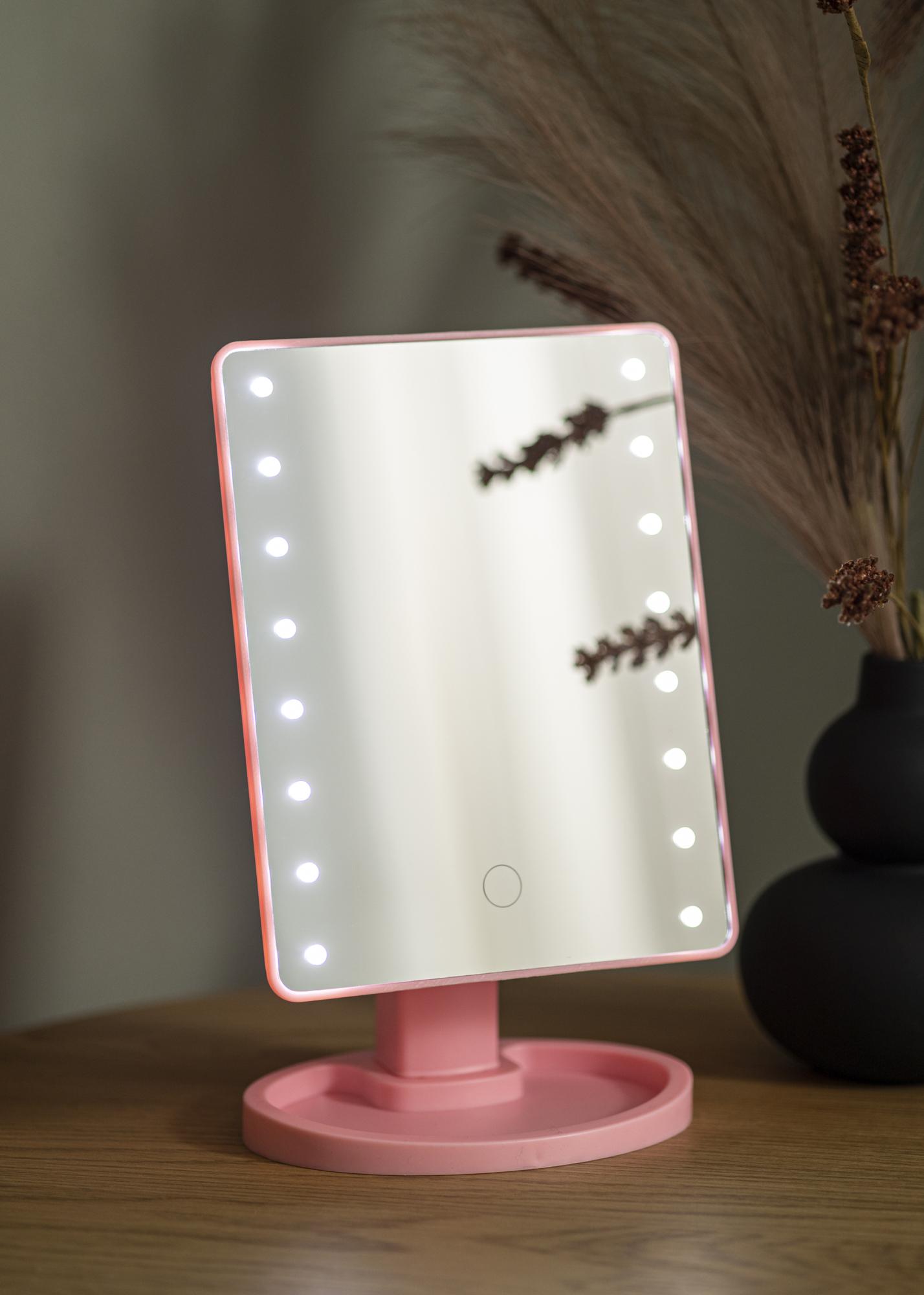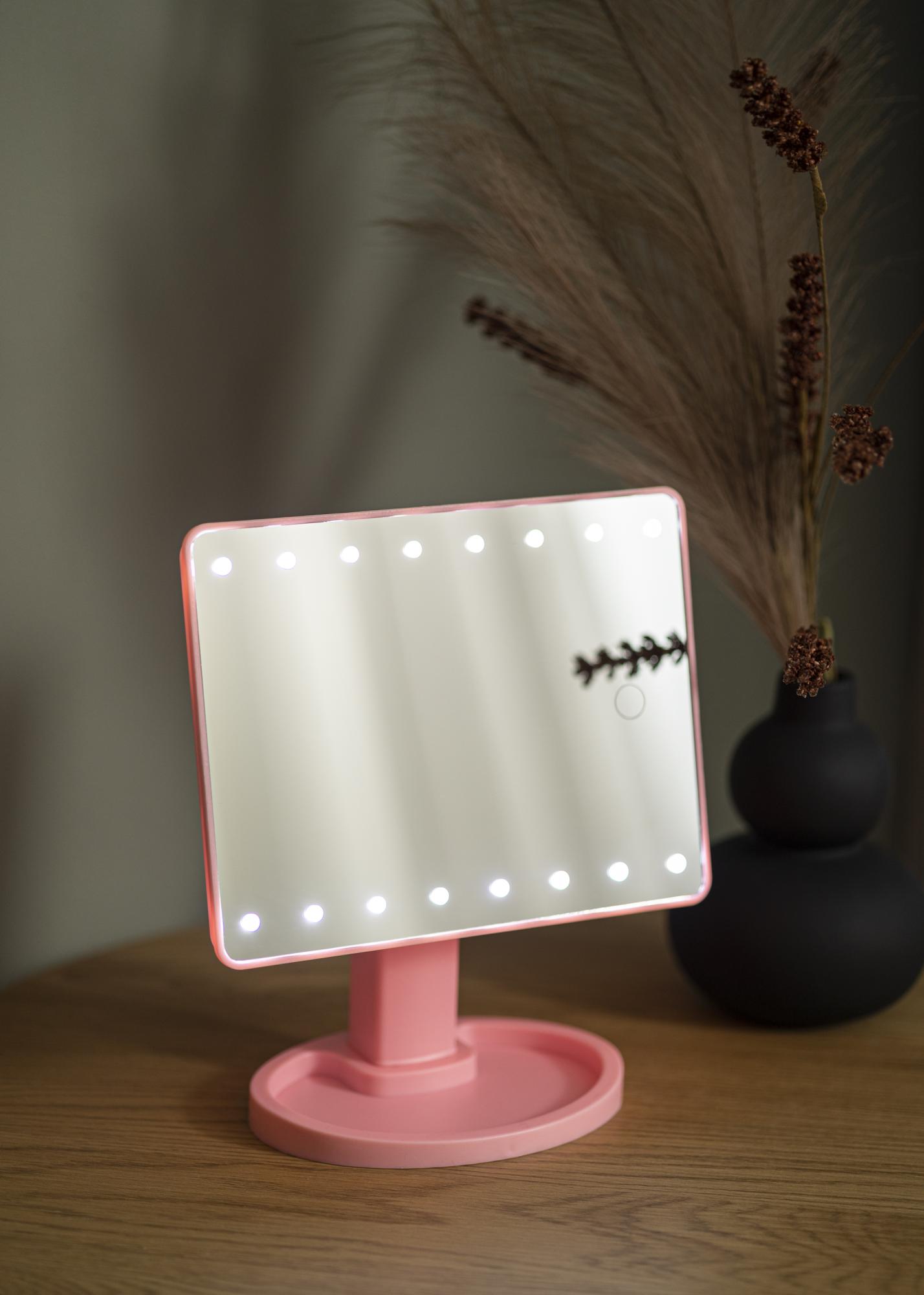 Dette sminkespeilet er et utmerket valg for deg som vil ha et lite speil med stilig design. Den rosa fargen blir en herlig fargeklatt, samtidig som den integrerte LED-belysningen gir et jevnt, kaldt hvitt lys når du speiler deg. Du slår på speilet ved hjelp av bryteren på baksiden. Belysningen kan også dimmes, så du kan stille inn lysstyrken slik du vil. Du dimmer lyset med touch-knappen på forsiden.
