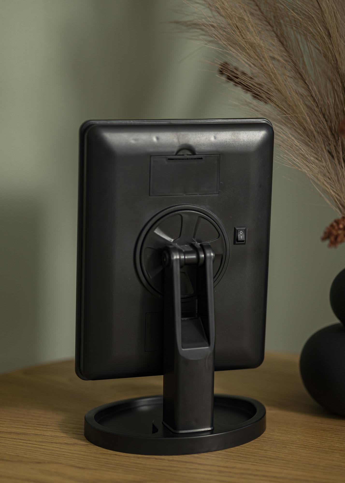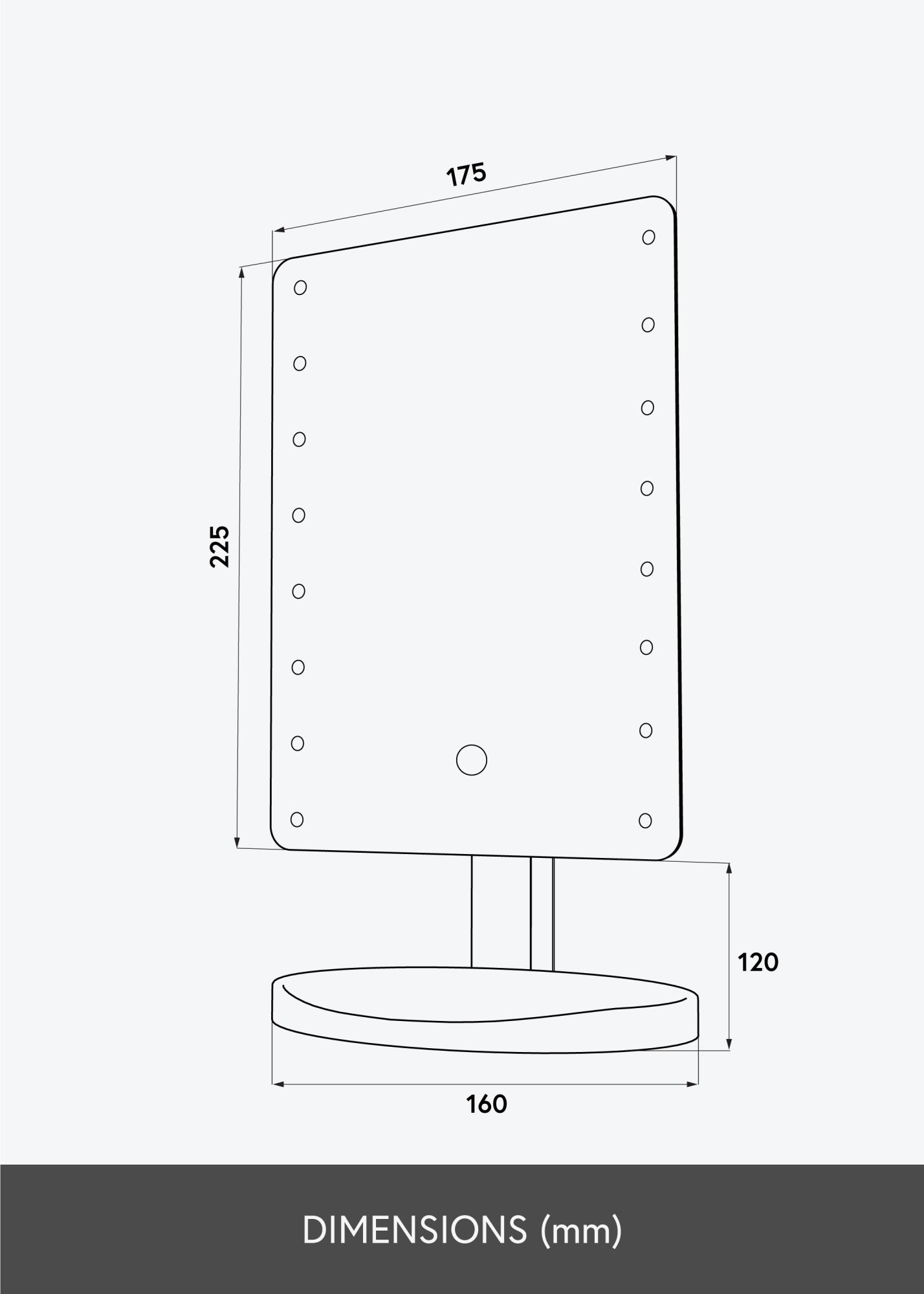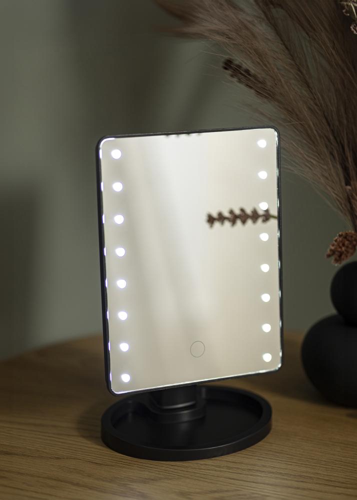 Dette er et praktisk sminkespeil med fot, utstyrt med integrert LED-belysning som rammer inn den 22,5x17,5 cm store speilflaten. Det stilrene designet med nøytral svart farge gjør speilet til en flott interiørdetalj som passer bra i alle rom. Speilet kan vinkles, noe som er perfekt når du vil sminke deg og gjøre deg klar for dagen. Speilet er bærbart, noe som gjør det enkelt å ta med seg.