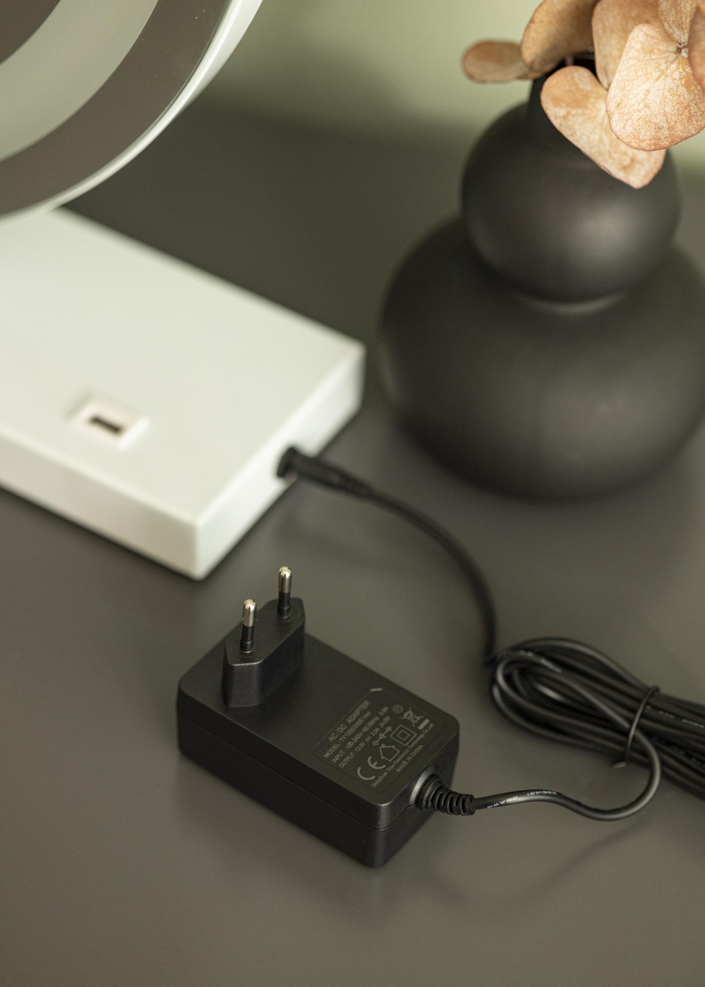 Dette speilet har enda en finesse – et USB-uttak til lading av smarte enheter. På den måten kan du lade telefonen og samtidig ha den i nærheten når du sminker deg og gjør deg klar. Speilet kobles til strøm via stikkontakt.