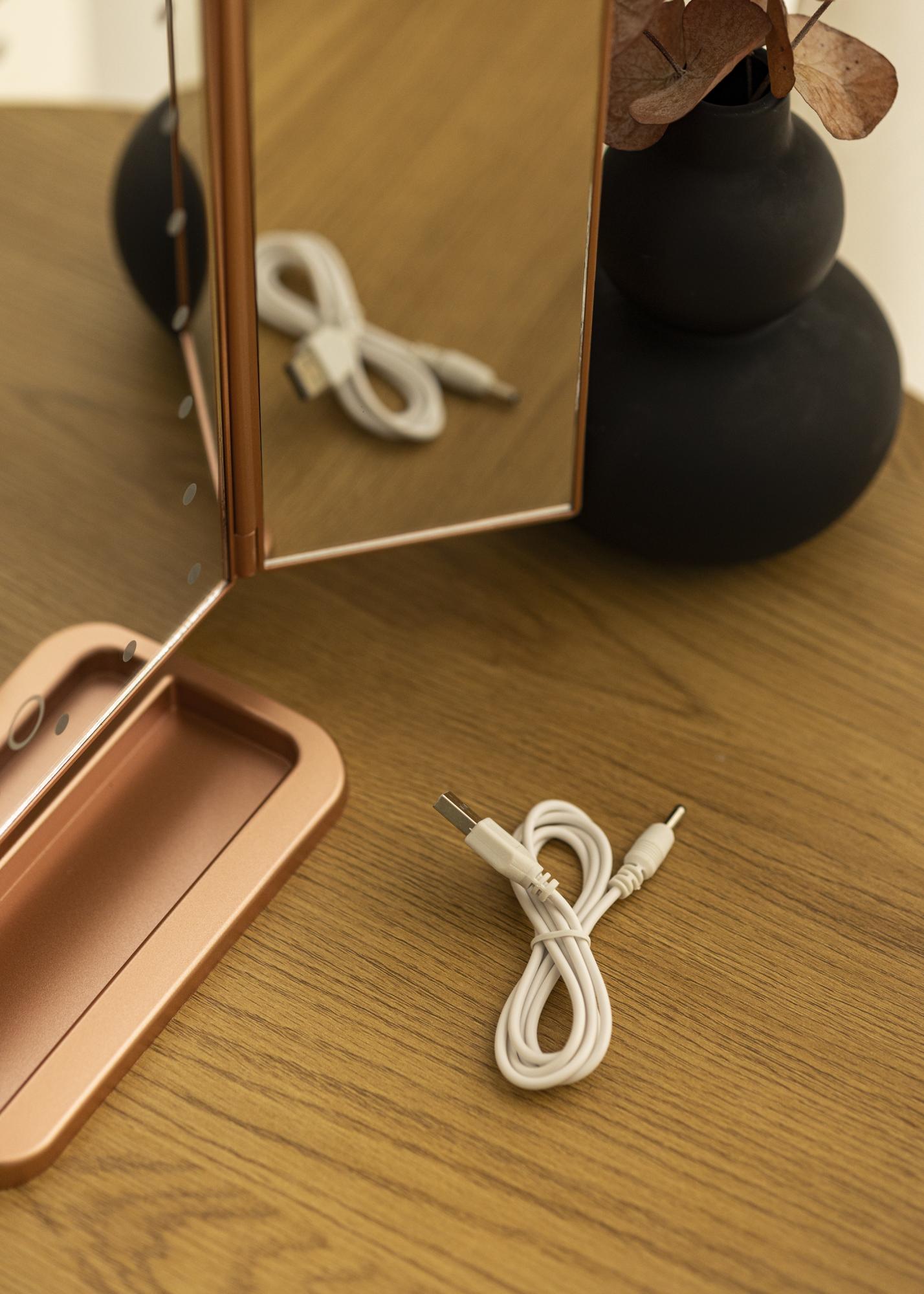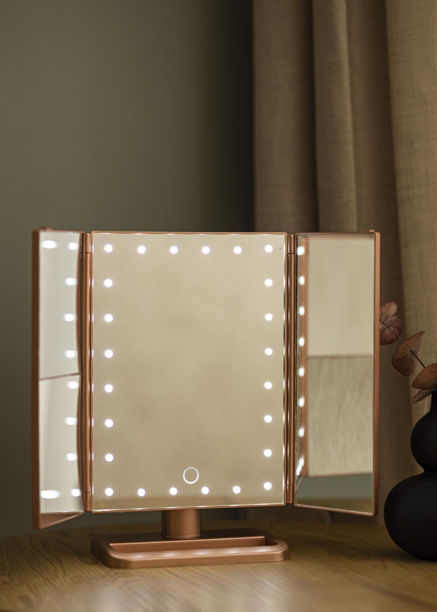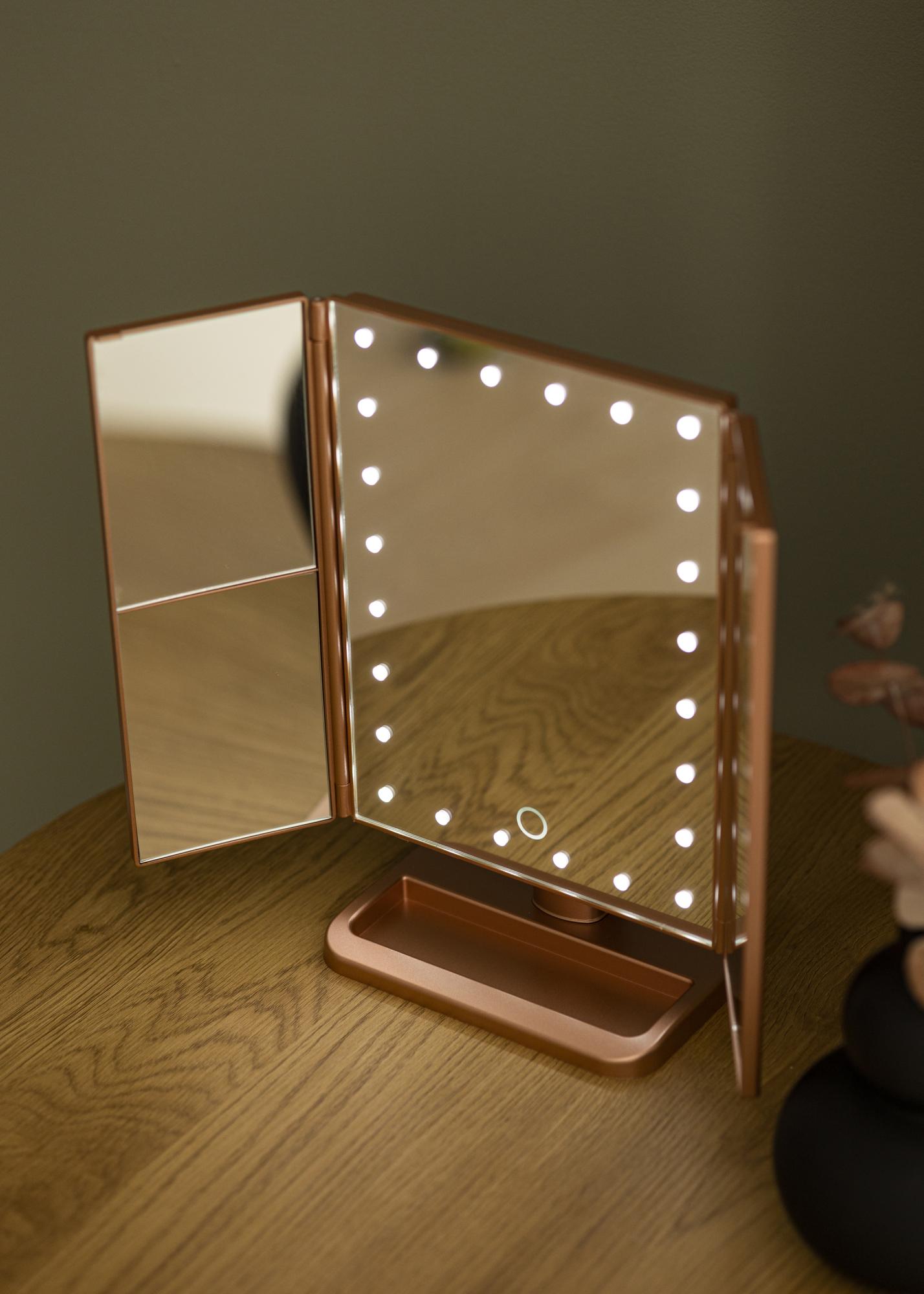 Speilet har stående design og trendy roségullfarge. Sidene på speilet kan foldes inn, noe som gjør at du enkelt kan vinkle dem ved bruk. For at du skal kunne fokusere bedre når du sminker deg, har speilet 2x, 3x og 10x zoom. Områdene med zoom-funksjon sitter på de små speilflatene på sidene av speilet.
