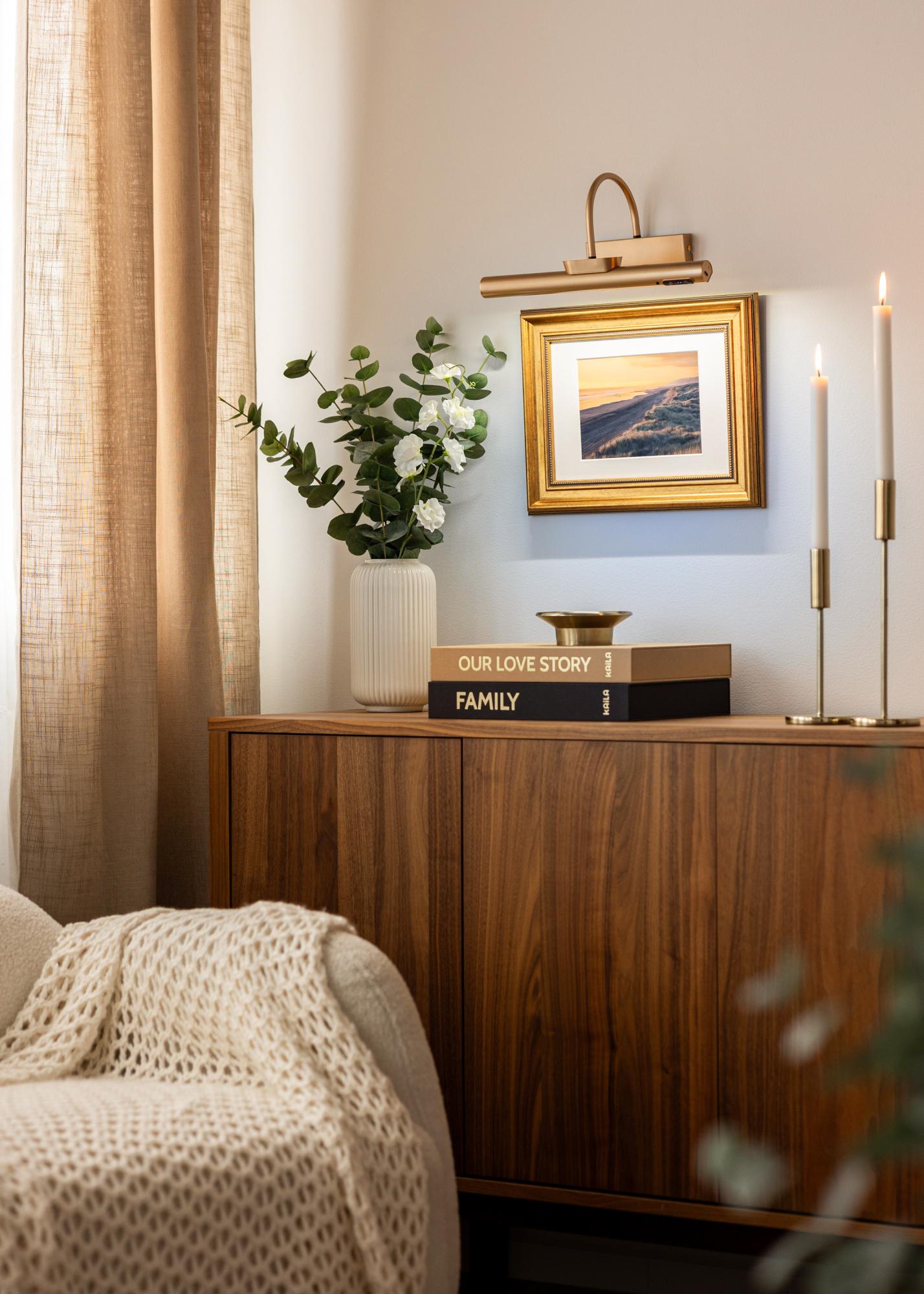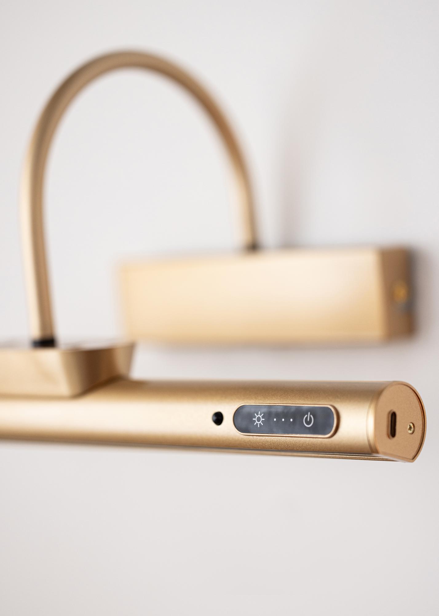 Bildebelysningen har en dybde på 14 cm og en lengde på 35 cm, hvilket gjør den ideell for å belyse bilder opp til 60 cm i bredde. Den elegante gullfargen gir en luksuriøs og sofistikert følelse, perfekt for å passe inn i alle typer interiører. Lyskilden er en energieffektiv LED med justerbar lysstyrke mellom 262 og 300 lumen, hvilket gir et behagelig lys som fremhever bildene dine på en myk og naturlig måte.