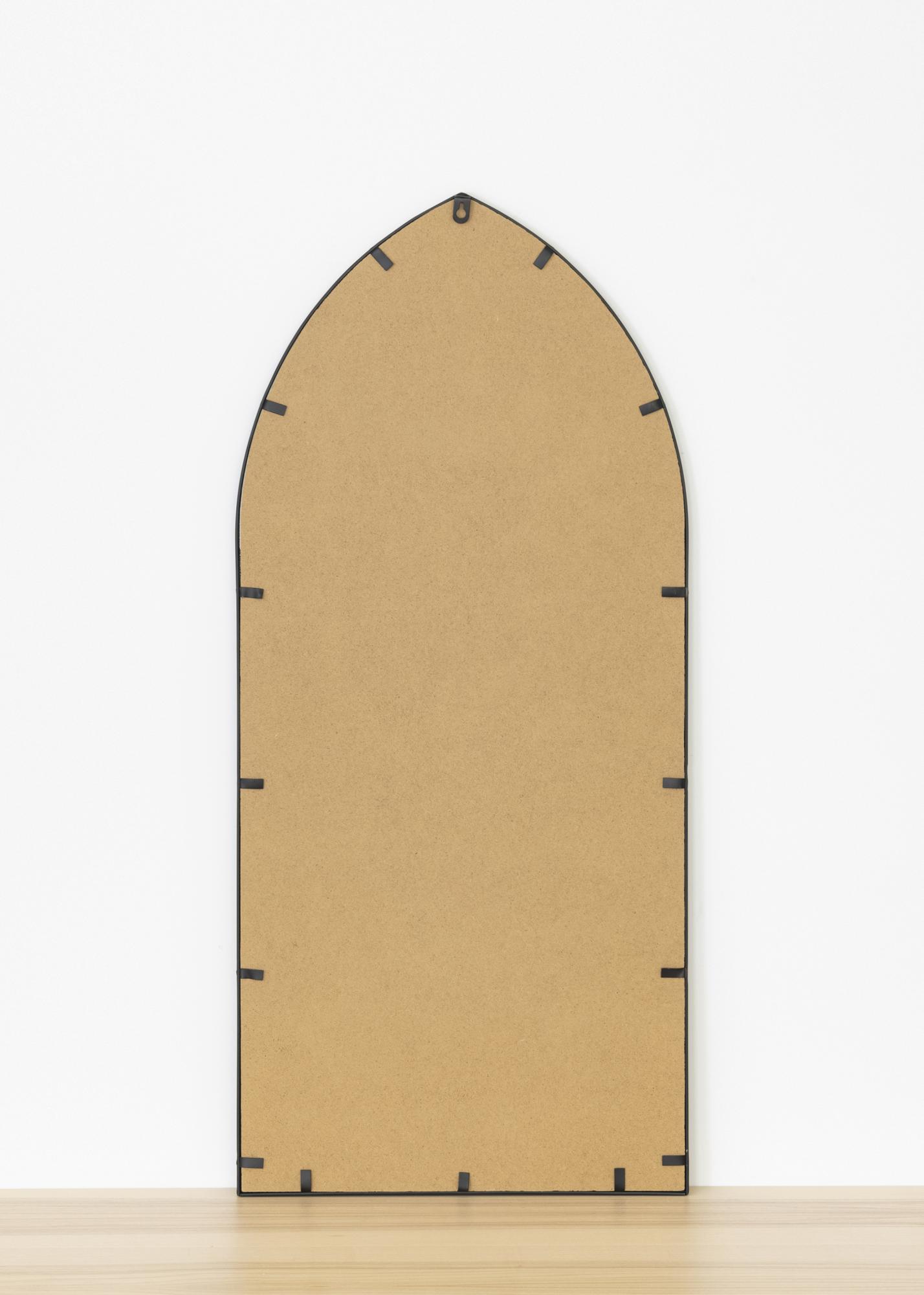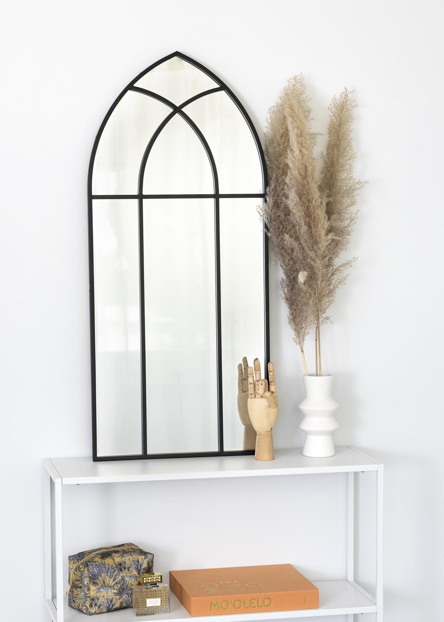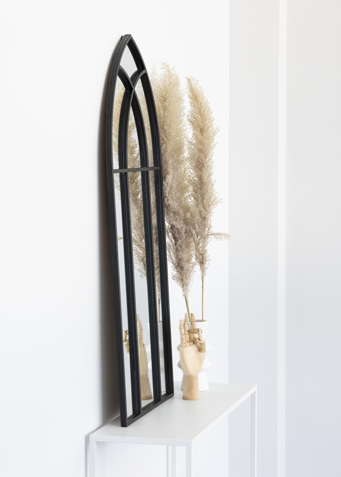 Dette er et veldig dekorativt speil som umiddelbart skaper en mer romantisk atmosfære i rommet der det plasseres! Speilet har en utforming som minner om et hagevindu og samtidig litt gotisk karakter. Speilets spennende form vil gjøre det til et blikkfang i hjemmet ditt! Speilet måler 45x100 og har et dekorativt mønster av svarte tynne linjer i metall.