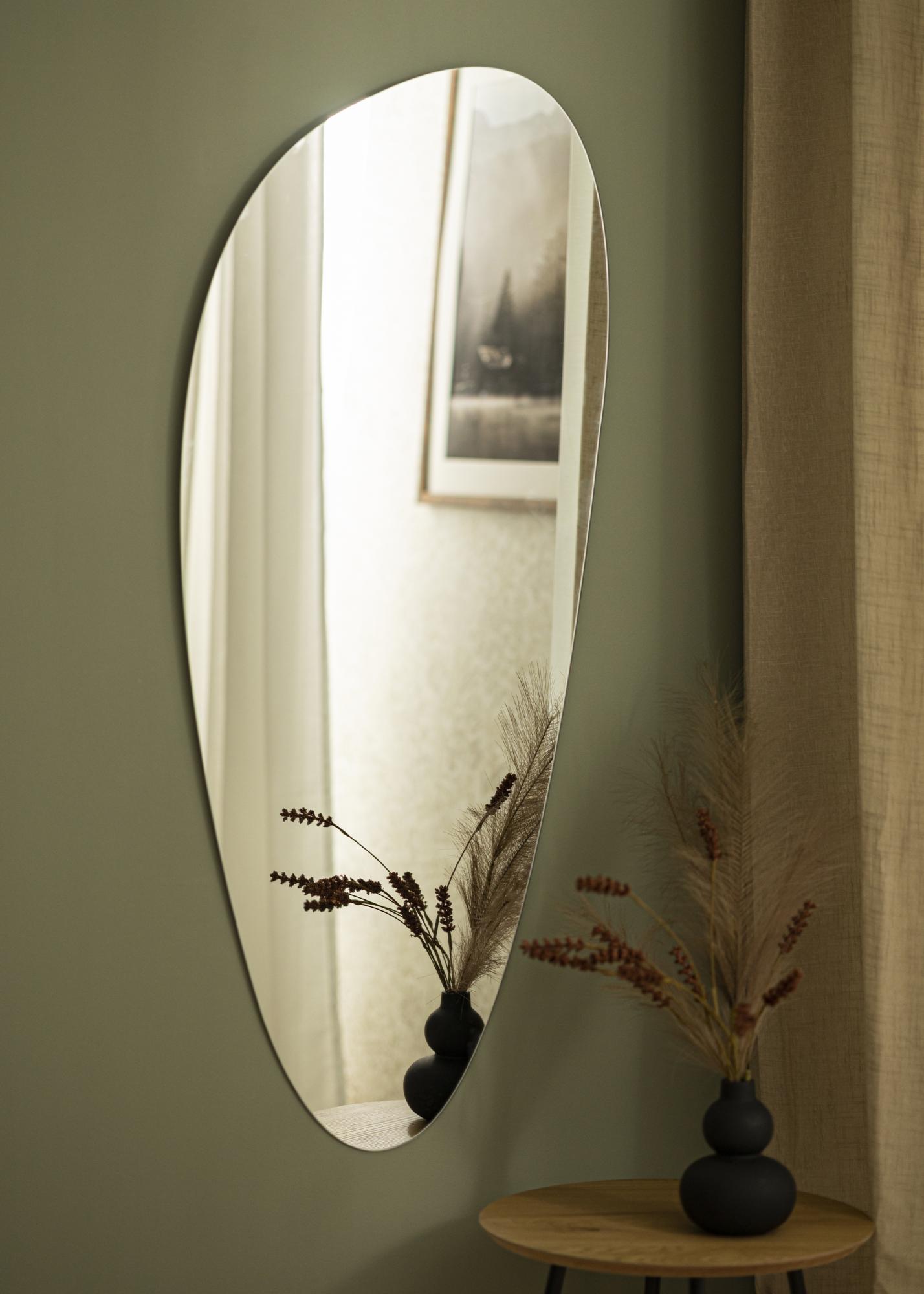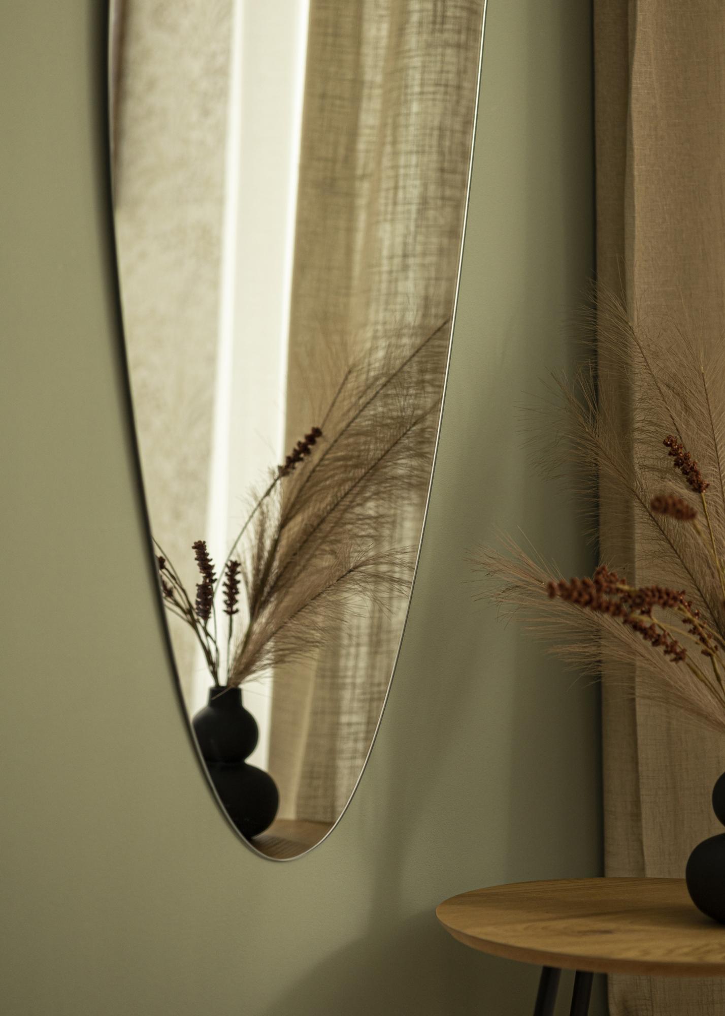 Denne veggspeilet er minimalisme på sitt beste – med et design uten ramme og en asymmetrisk, langstrakt form. Speilglassets tynnhet, på bare 4 mm, forsterker den stilrene minimalistiske følelsen ytterligere.