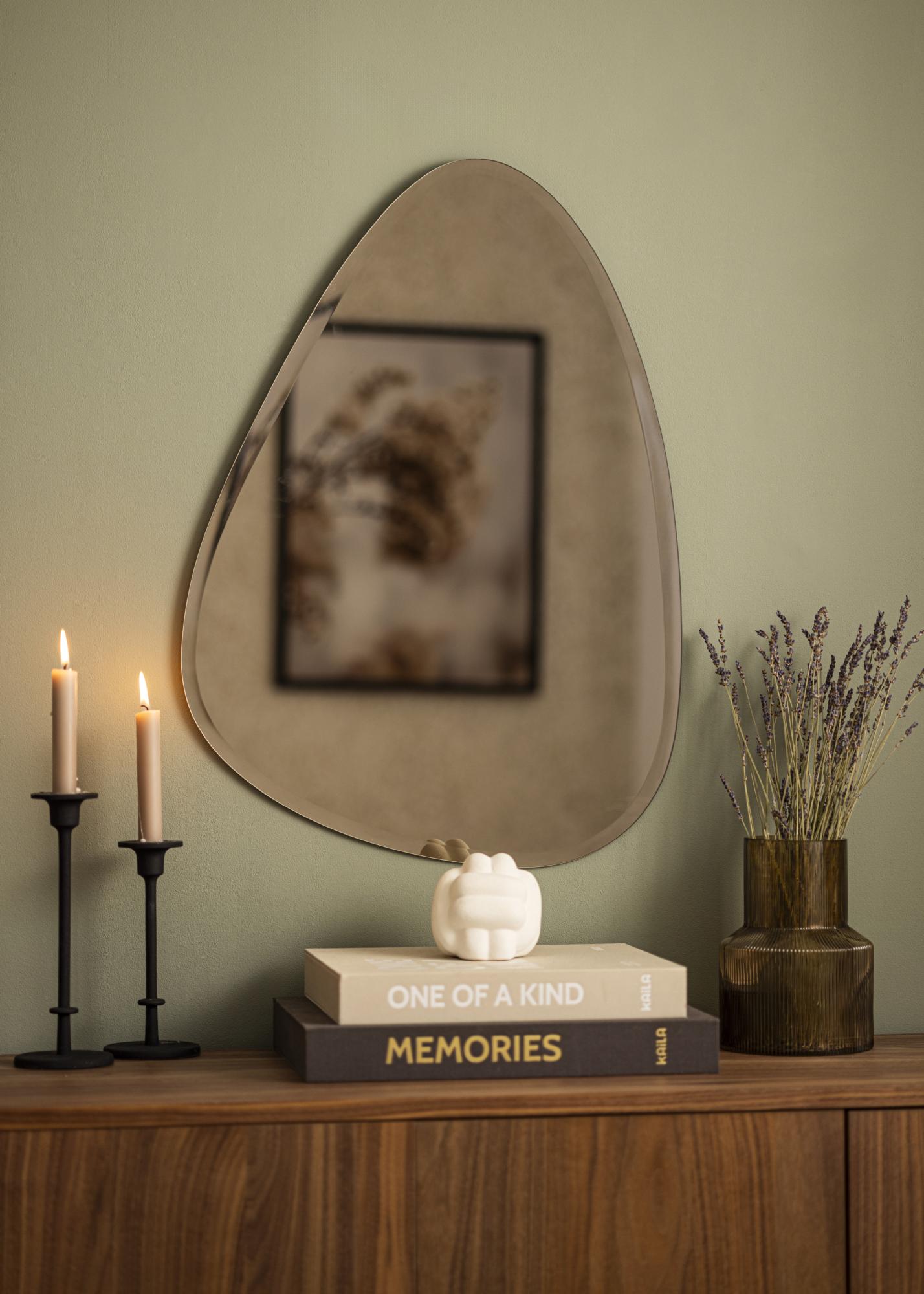 Dette er et asymmetrisk veggspeil fra KAILA, med moderne bronsefarget speilglass. Et speil med mørkere speilglass blir en dramatisk detalj som passer perfekt i moderne hjem. Det tynne speilet har ingen ramme. Isteden er speilflatens kanter dekorert med en elegant fasettslipt kant.