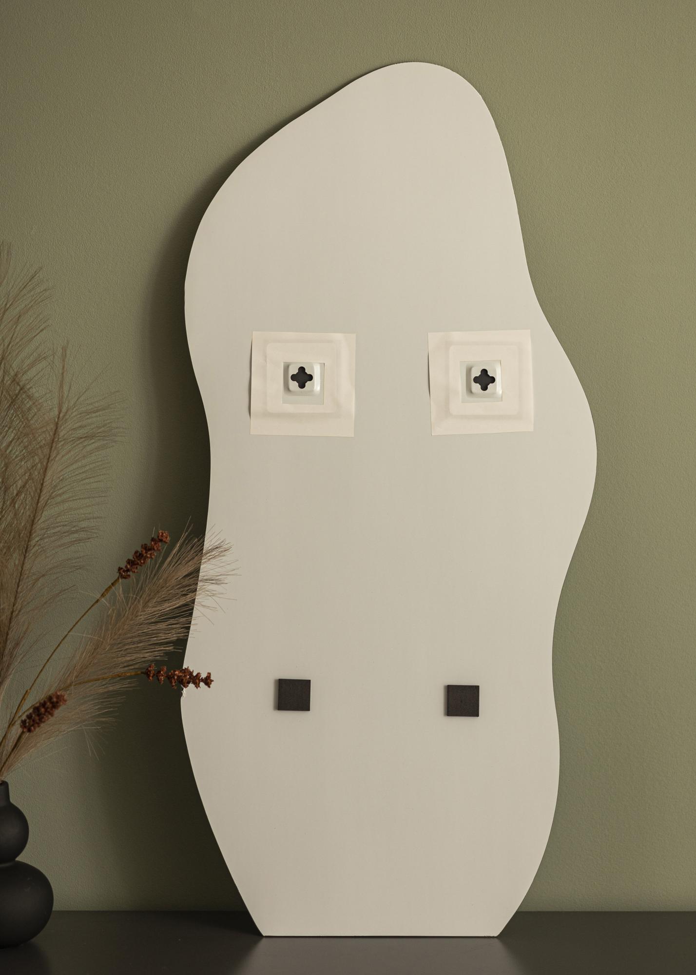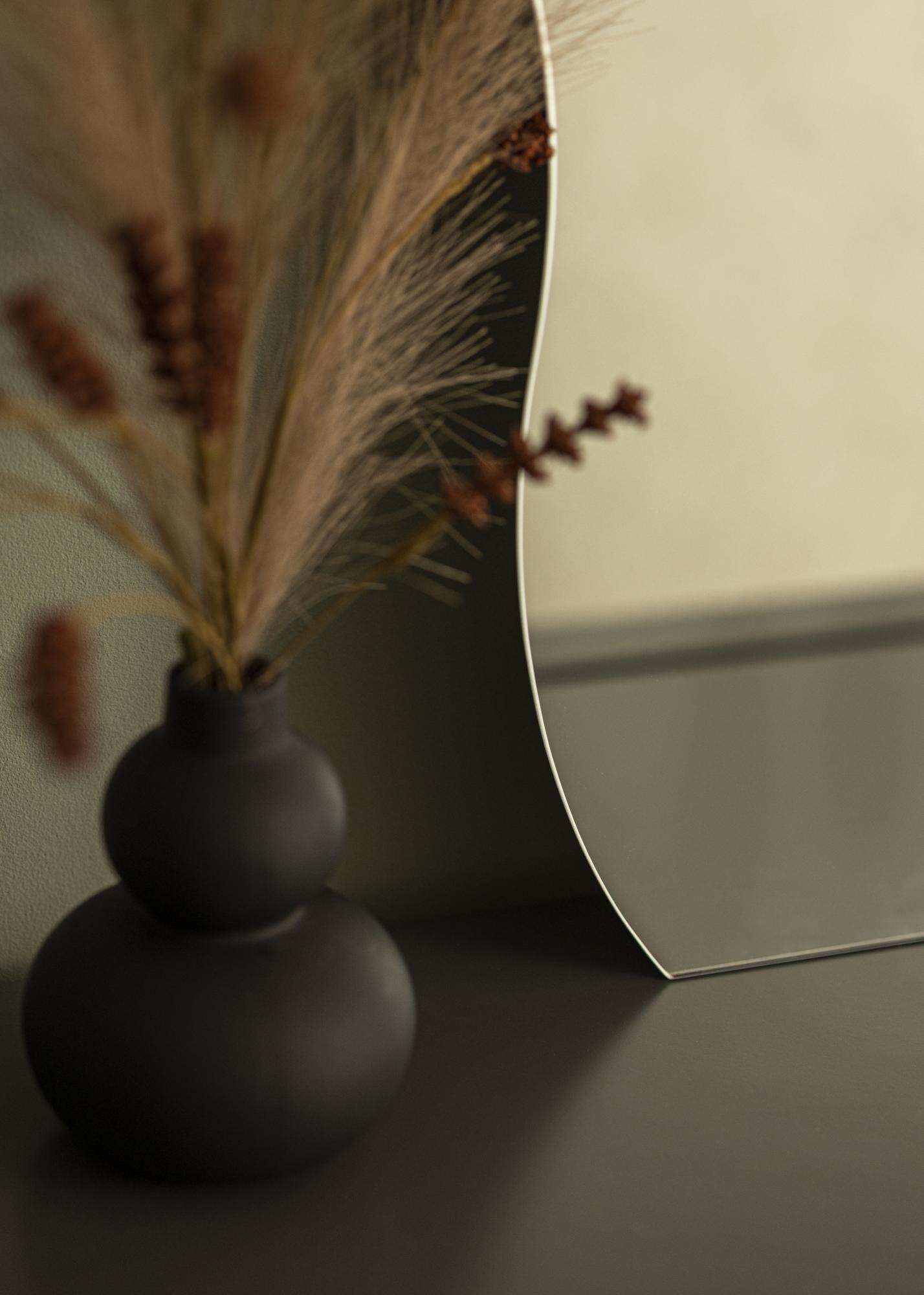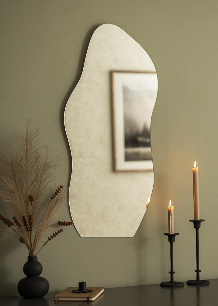 Dette er et vegg speil i trendy design, med sider som har en myk bølgende form. Nedre kant er rett, noe som gjør at speilet blir ekstra elegant å henge over et møbel, der speilets nedre kant blir en parallell linje til toppen av kommoden eller sidebordet. Speilet har veggfester på baksiden og monteres på veggen i stående stilling.