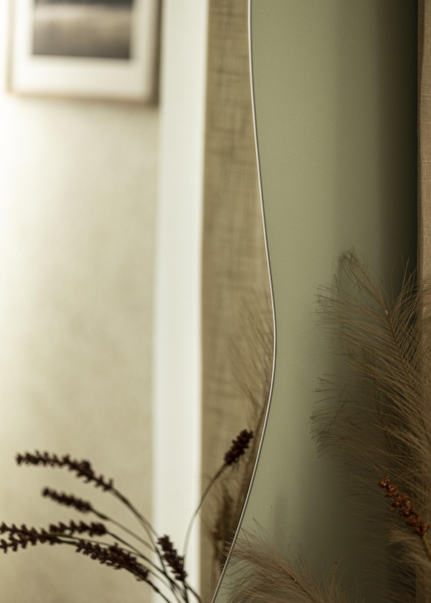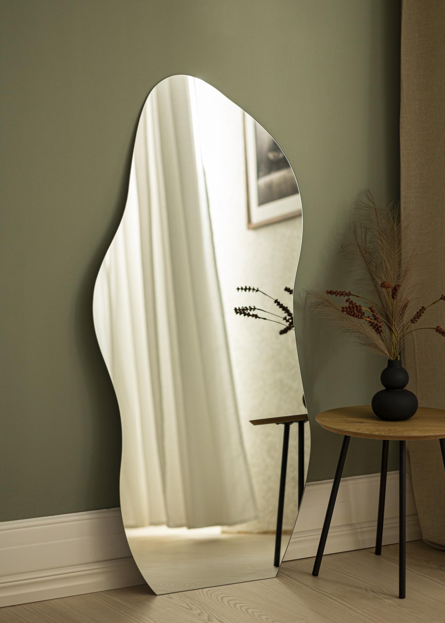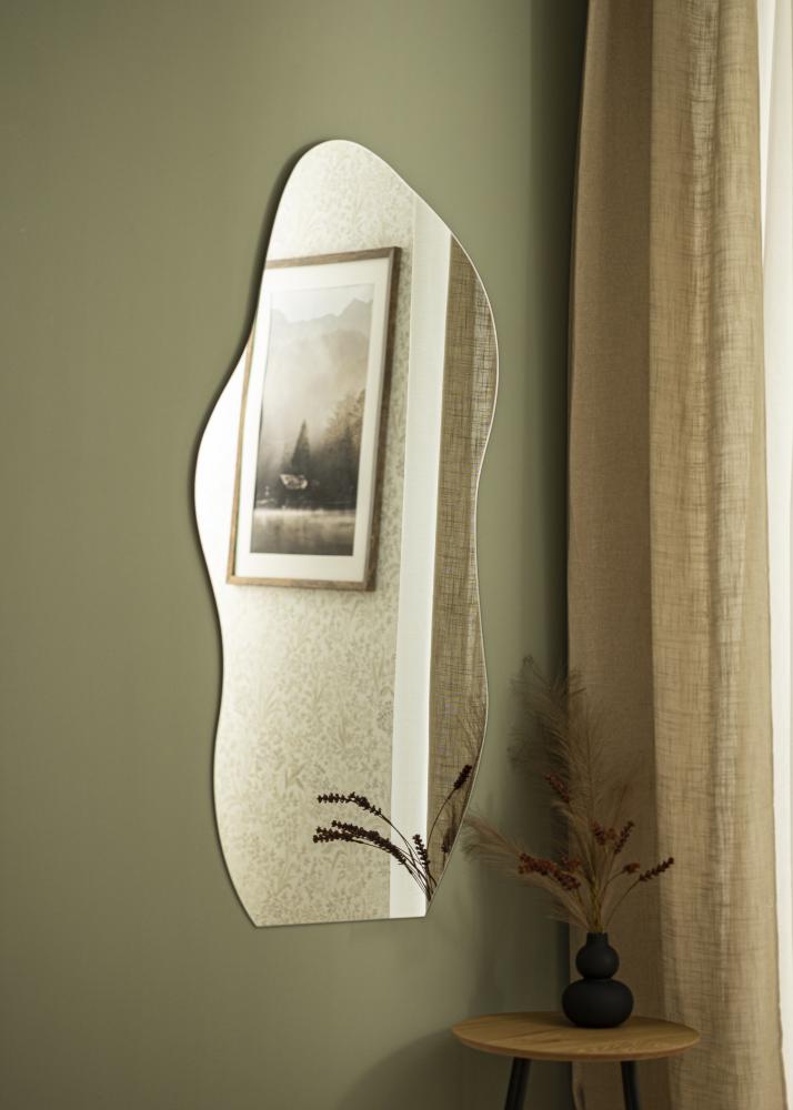 Dette er et vegg speil i trendy design, med sider som har en myk bølgende form. Nedre kant er rett, noe som gjør at speilet blir ekstra elegant å henge over et møbel, der speilets nedre kant blir en parallell linje til toppen av kommoden eller sidebordet. Speilet har veggfester på baksiden og monteres på veggen i stående posisjon.