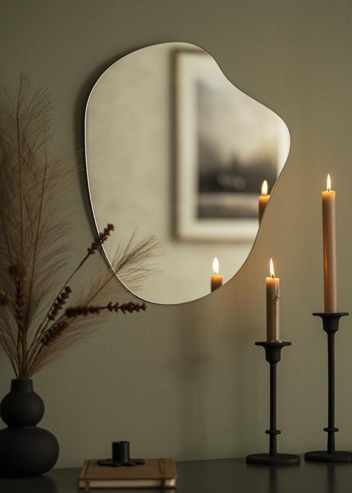La denne trendy veggspeilet bli en spennende interiørdetalj som vakkert reflekterer lys fra vinduer og lamper. Den unike formen og fraværet av ramme gir speilet dets karakteristiske utseende, som er både moderne og minimalistisk.