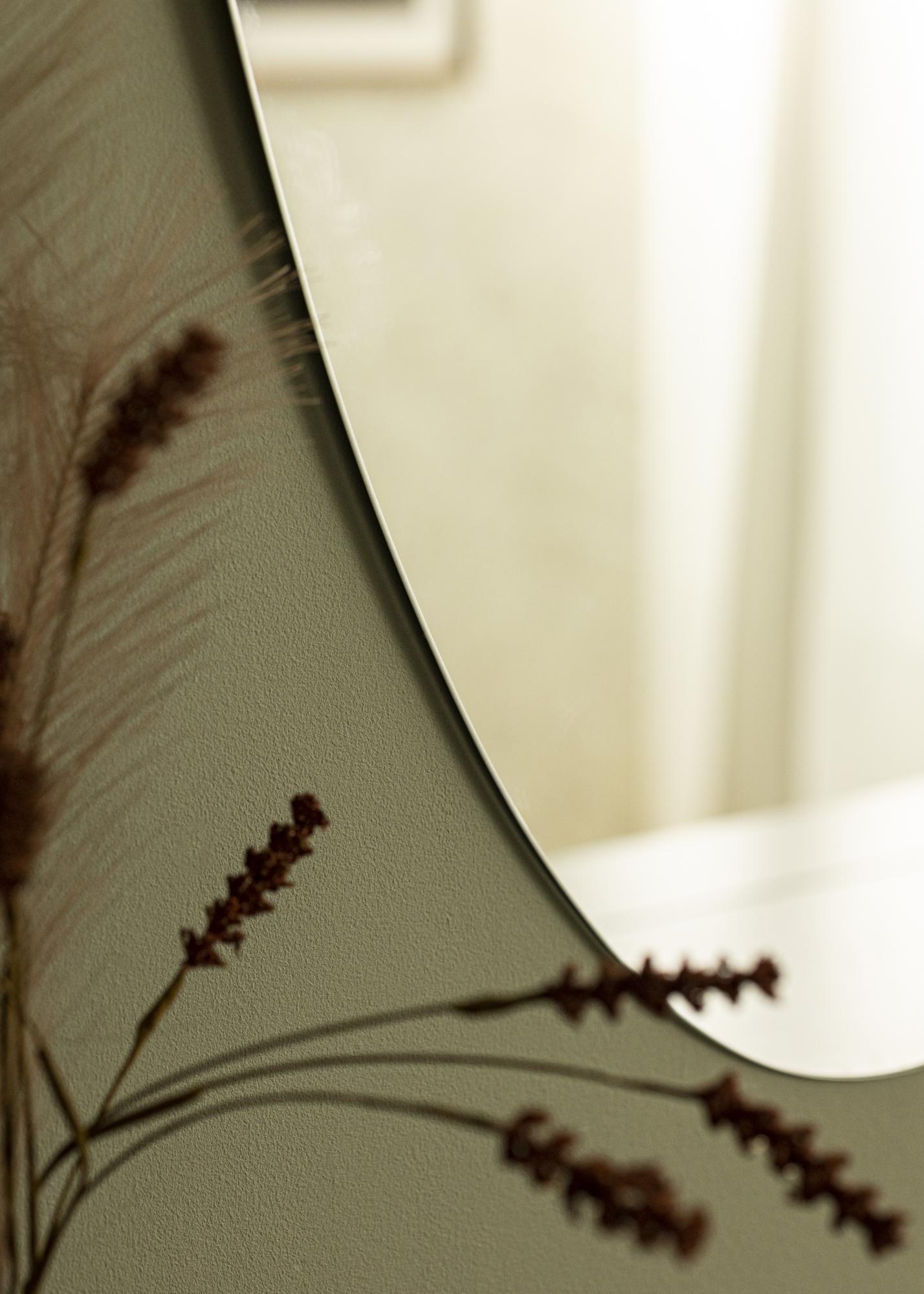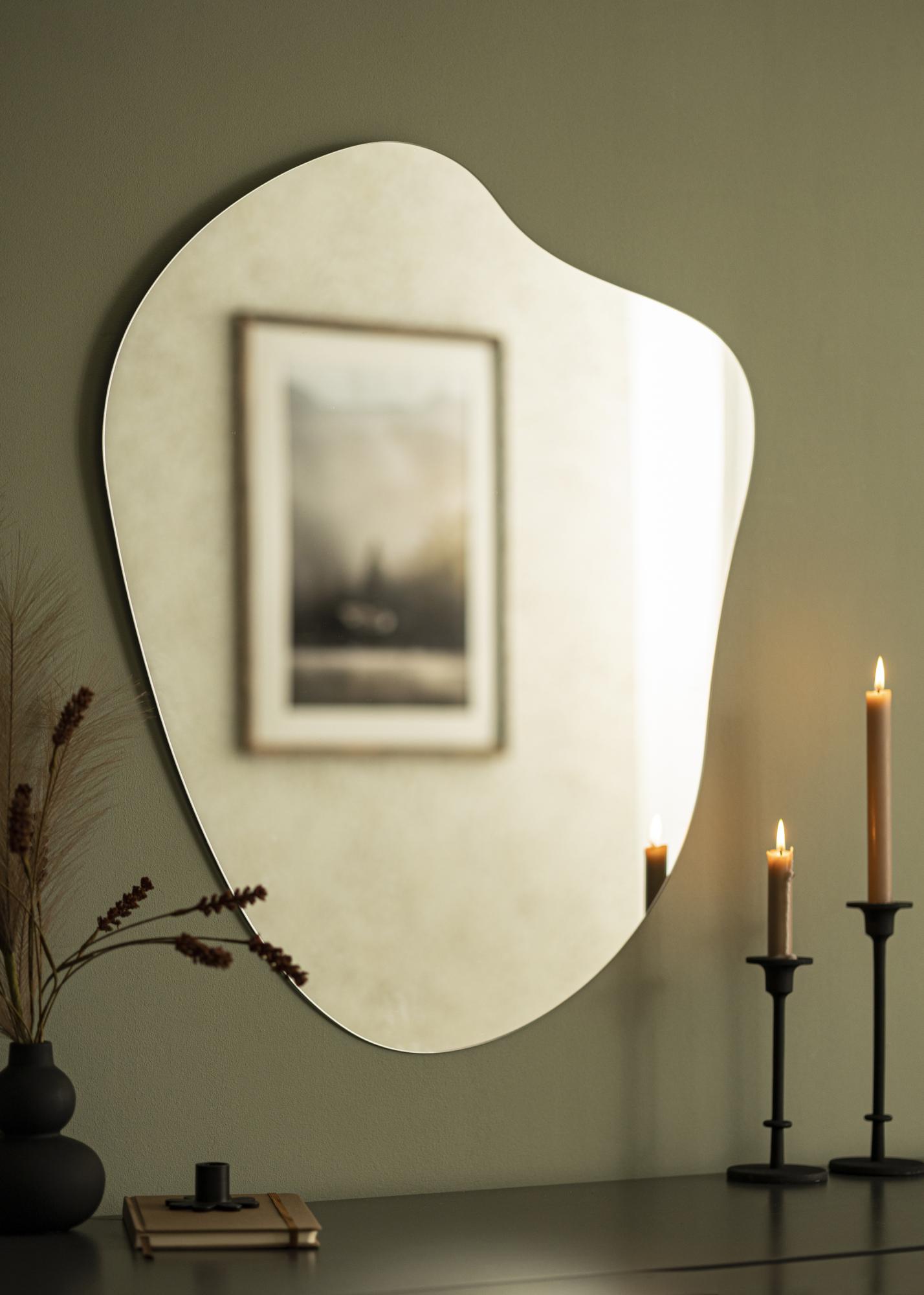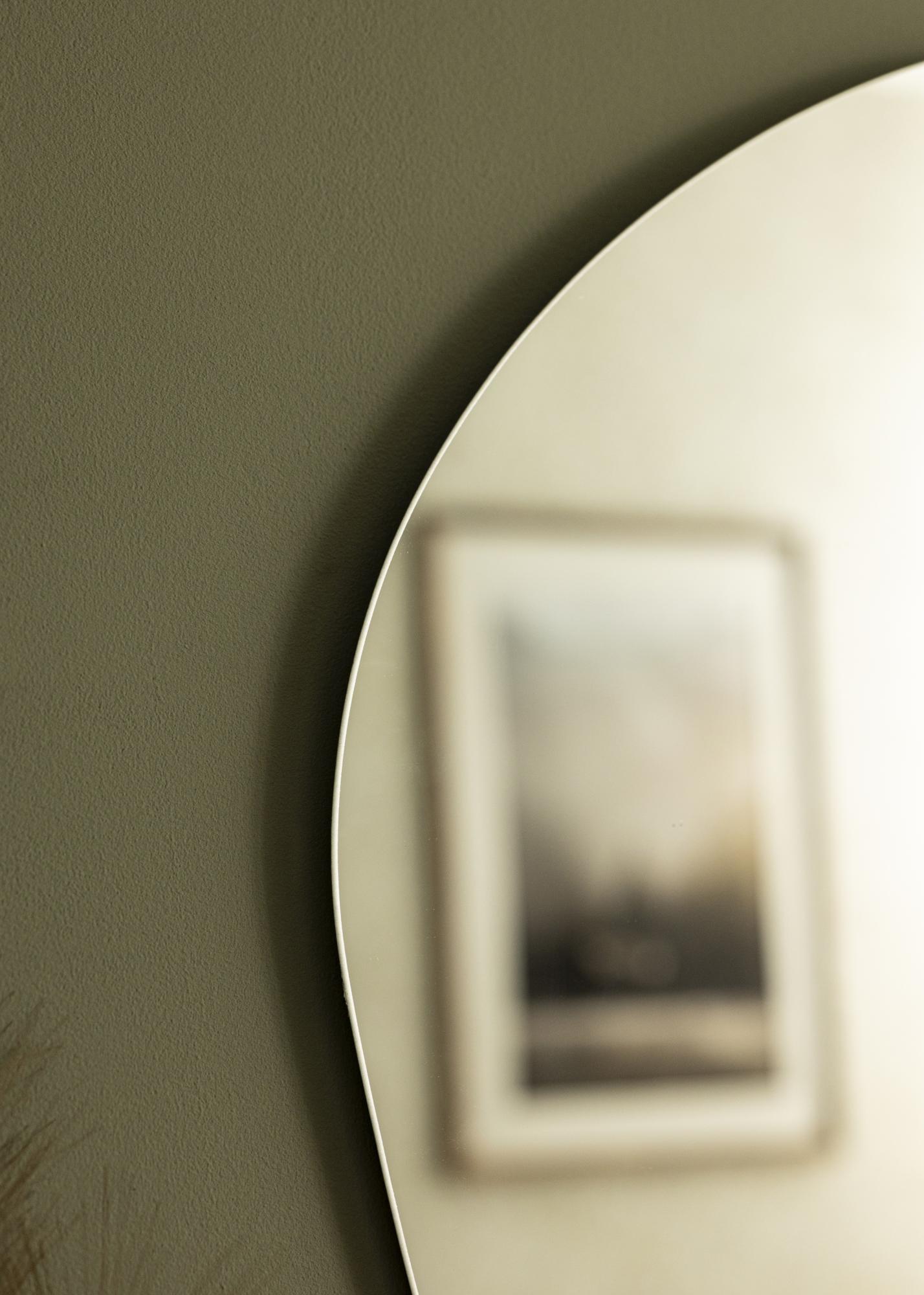 La denne trendy veggspeilet bli en spennende interiørdetalj som vakkert reflekterer lys fra vinduer og lamper. Den unike formen og fraværet av ramme gir speilet dets karakteristiske utseende, som er både moderne og minimalistisk.