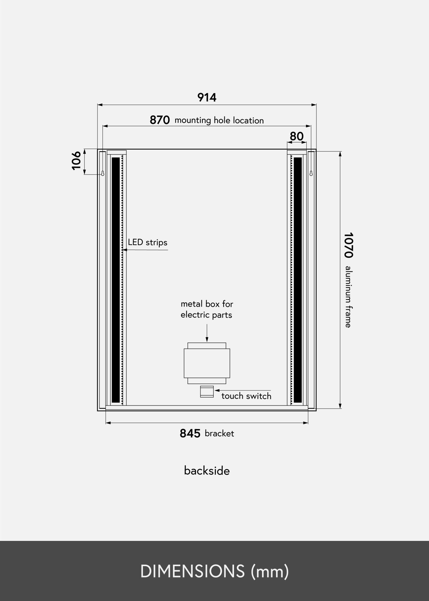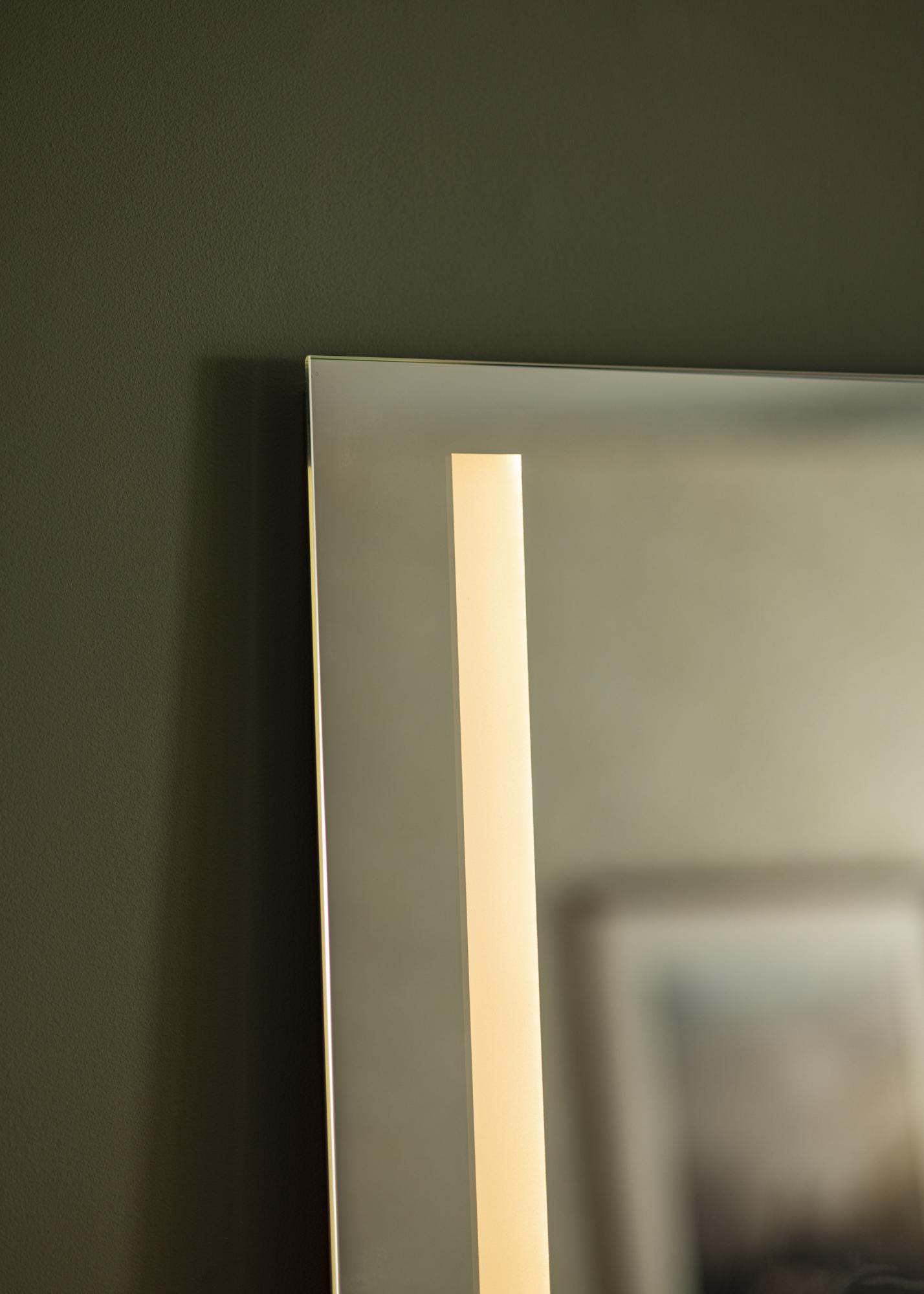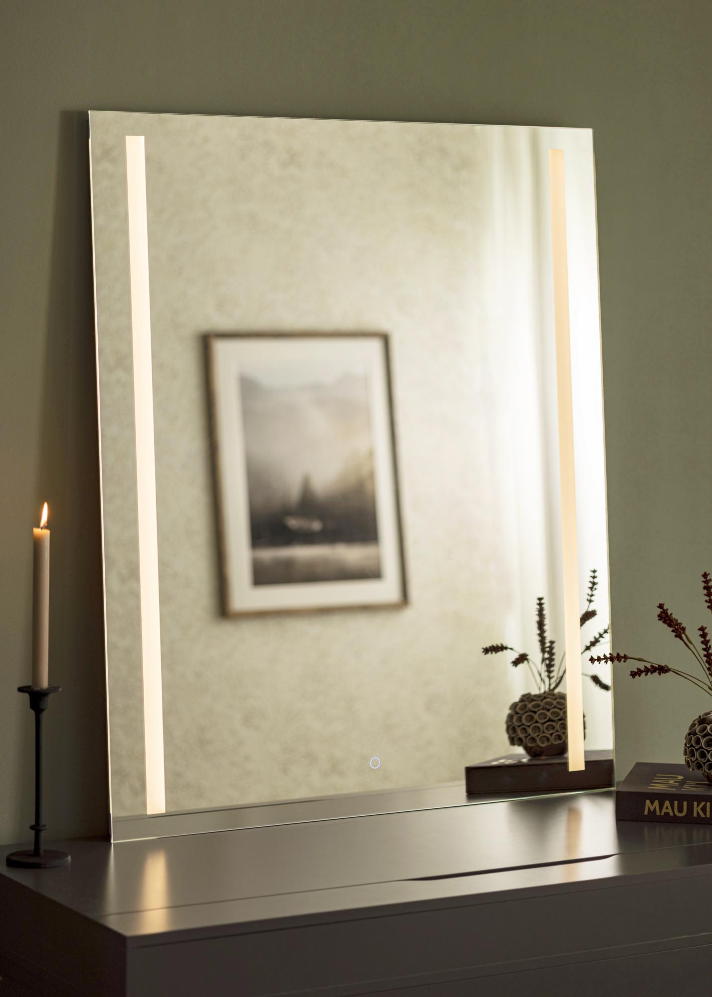 Dette er et elegant speil med belysning og en klassisk rektangulær form. Belysningen består av to LED-lyssløyfer som er plassert et lite stykke inn på speilflaten. Det gir et stilig minimalistisk uttrykk som passer utmerket på badet. LED-belysningen har en behagelig fargetemperatur på 3000K, og for å gjøre det bekvemt for deg kan du enkelt dimme belysningen ved å holde inne touch-knappen på baderomsspeilets nedre kant. Du kan da stille inn 10-100% av lysstyrken. Speilet er beregnet for fast installasjon og kobles til en bryter. For at speilet skal fungere på riktig måte, skal det kobles til en vanlig bryter, ikke en dimmerbryter.