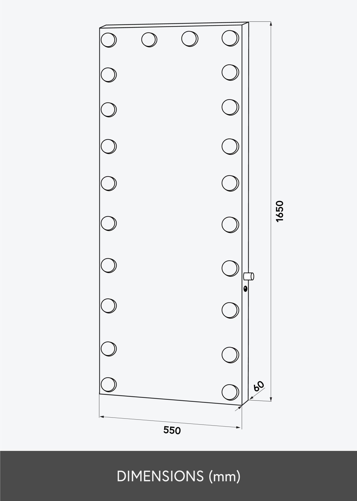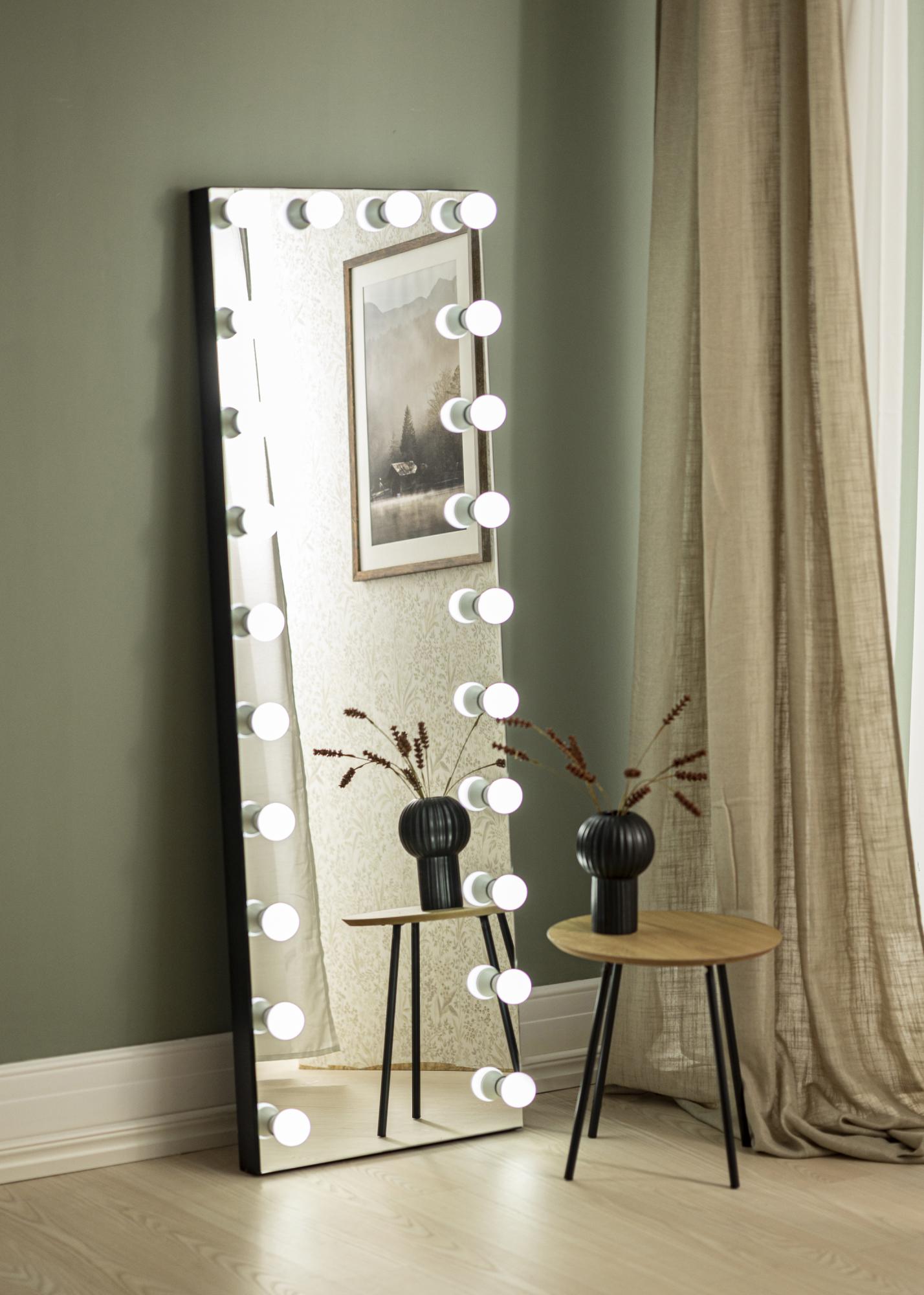 Veggspeilet har 22 store LED-lyspærer som på en vakker måte rammer inn speilflaten, og som hjelper til med å gi speilet sitt glamorøse utseende. Ved hjelp av en liten dreieknapp på den ene langsiden av speilet kan du dimme lyset etter eget ønske. Speilet kobles til strøm via stikkontakt.