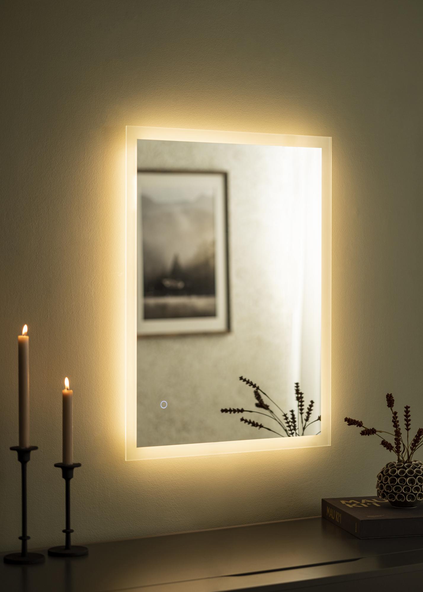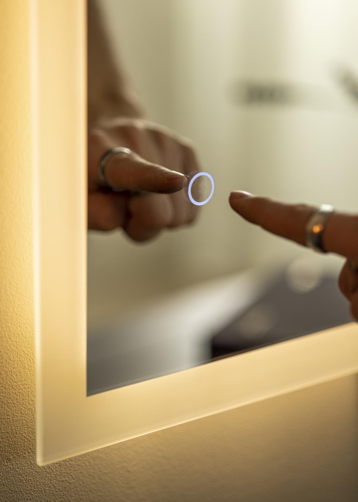 Gi badet ditt et løft med dette elegante speil med lys fra det svenske merket KAILA. Dette tidløse speilet er designet med en unik LED-lyssløyfe på baksiden som gir en myk belysning og skaper en vakker ramme rundt speilflaten. Den innbygde belysningen produserer et behagelig lys på 3000K, og lysstyrken kan enkelt justeres fra 10% til 100% ved å holde inne touch-knappen som er plassert i ett av speilets hjørner.