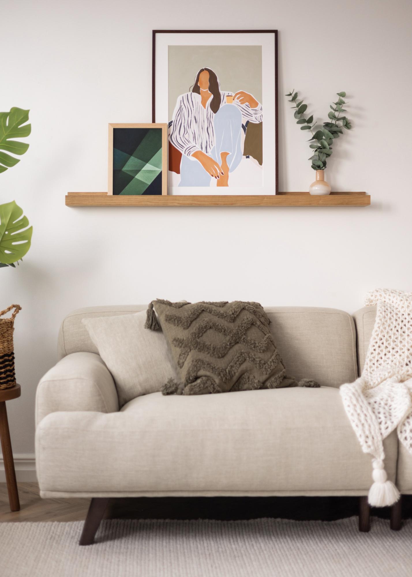 Med en praktisk bildehylle viser du frem bildene dine på en elegant måte og får dessuten utmerkede muligheter til å variere din veggkunst. Denne bildehyllen er laget av solid eik og har et stilrent design med enkle, rette linjer. Selve hylleplanet har en utfreste spor som gir støtte til bildene dine og gjør at de får en fin vinkel der de står lent mot veggen. Bildehyllen finnes i flere ulike lengder, hvorav denne varianten har lengden 130 cm. Bildehyllen har også forborede hull, og for å gjøre det hele enda litt enklere følger det også med passende skruer og plugger.