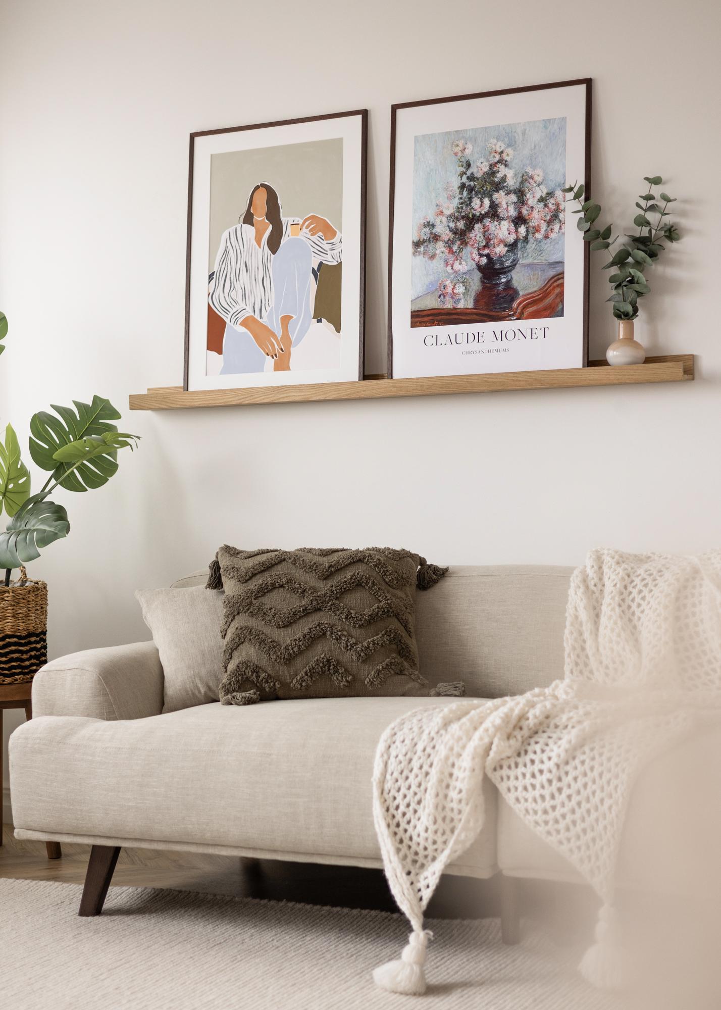 Med en praktisk bildehylle viser du frem bildene dine på en elegant måte og får dessuten utmerkede muligheter til å variere din veggkunst. Denne bildehyllen er laget i solid eik og har et stilrent design med enkle, rette linjer. Selve hylleplanet har en frest spor som gir støtte til dine bilder og gjør at de får en fin vinkel der de står lent mot veggen. Bilderammen finnes i flere ulike lengder, hvorav denne varianten har lengden 150 cm. Bildehyllen har også forborede hull, og for å gjøre det hele enda litt enklere medfølger også passende skruer og plugger.