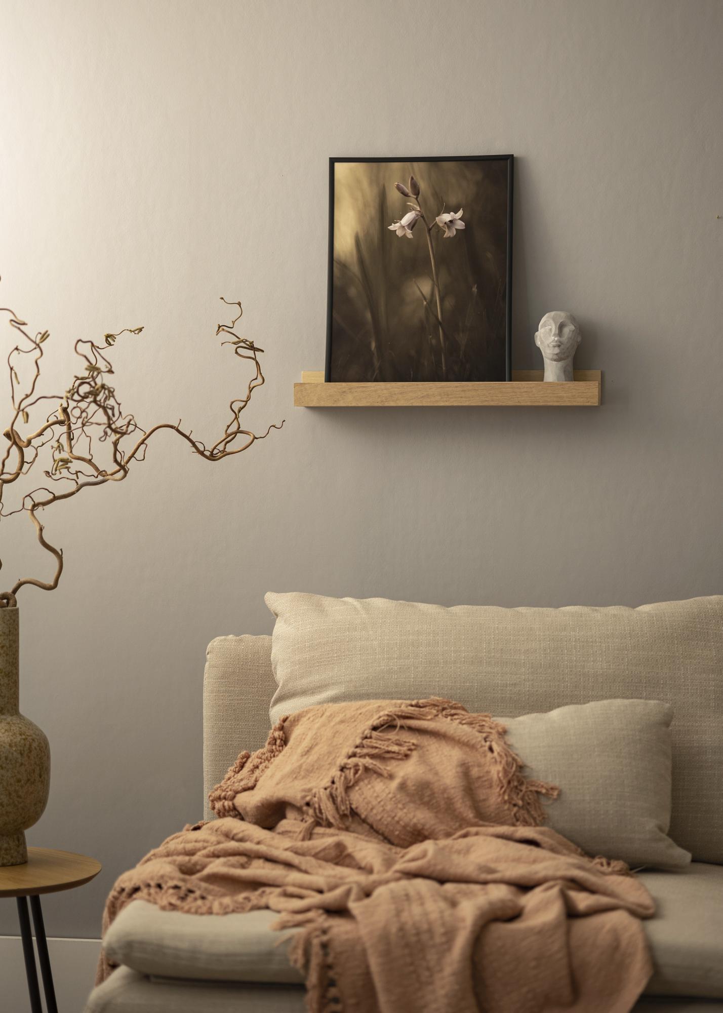 Med en bildehylle får du store muligheter til enkelt å variere din veggkunst! Det er en veldig praktisk innredningsdetalje som - foruten rammer - kan de også ha små ornamelnter, krydder krukker, små tilbehør - og mye, mye mer. Denne bildehyllen er laget i solid eik og har et stilrent desgin med rette, enkle linjer. Bildehyllen kommer i flere ulike lengder og denne varianten har lengden 50 cm. Selve hyllen har en liten utskjæring som dine rammer skal lene seg mot. Dette gjør at rammene får en perfekt vinkel når de lener seg mot veggen. Bildehyllen har også ferdig borrede hull og med i pakken kommer det skruer og plugger - noe som gjør det enda litt enklere!