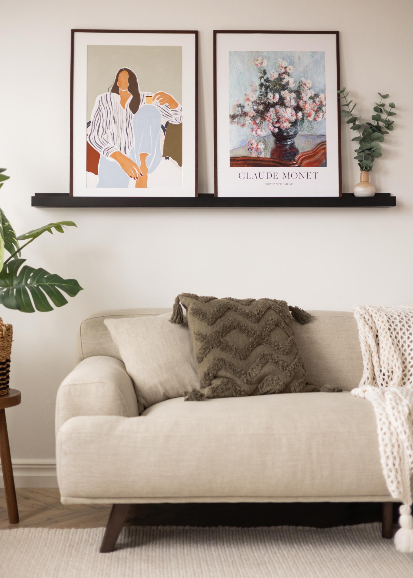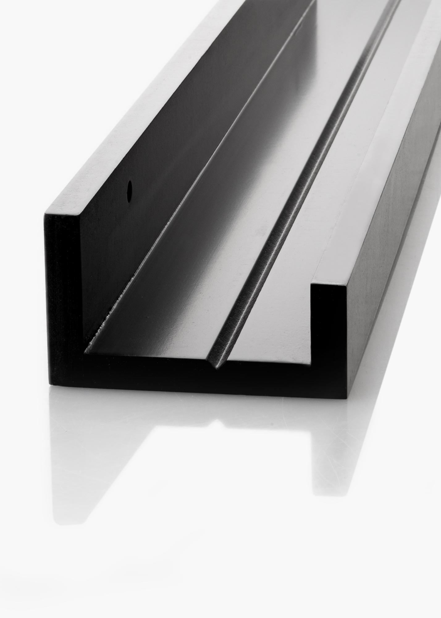 Vis og varier veggkunsten din enkelt og stilfullt med en elegant bildehylle! Denne bildehyllen er laget av MDF og er trendy svartmalt med en fin, halvblank overflate. Bildelisten har et stilrent design med rette, enkle linjer og en minimalistisk følelse. Hylleplanet har et frest spor i midten som fungerer som støtte til bildene dine og gir dem en fin vinkel der de står lent mot veggen.