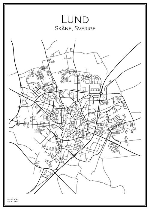 Plakat over gatenettet i byen som har Sveriges største universitet, Lund. et sorthvite trykket viser de delvis middelalderske veiene stilisert på en grafisk poster med stedsnavnet og koordinatene i en stilren font. Med en vakker ramme blir plakaten en fin gave til en tidligere student, eller noe å henge på veggen i hjemmet.