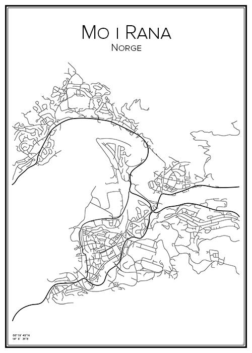 Poster med stilisert kart over byen Mo i Rana, hjemsted til Arctic Circle Raceway – landets største racingbane. Kartets grafisk stilrene utforming gjør at posteren passer inn i alle miljøer, og den er lett å matche med resten av innredningen ved å komplettere med en bilderamme som passer til møblene i rommet. Bildet er også en fin gave å gi til noen som har tilknytning til byen, eller til noen som interessert i motorsport.