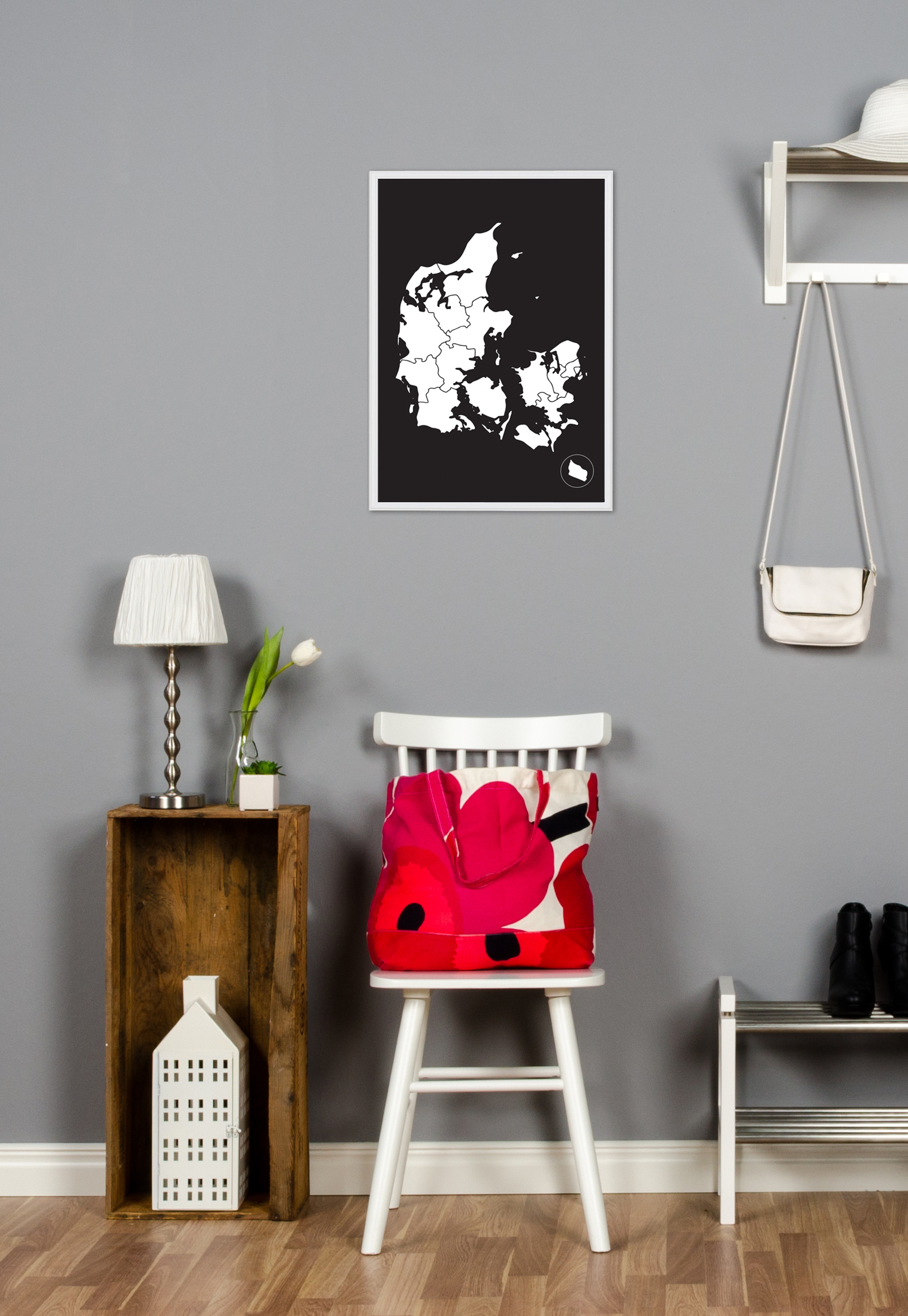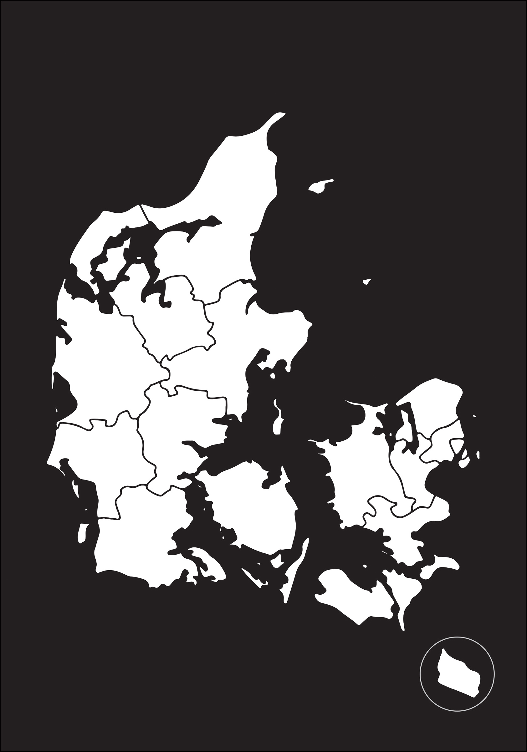 Sett stil på en ellers kjedelig vegg med grafiske svarthvite plakater! Her har vi et fint kart over Danmark trykket i svart mot en hvit bakgrunn. Designet matcher like bra sammen med en svart ramme som med en fargerik. Velg mellom 8 ulike størrelser!