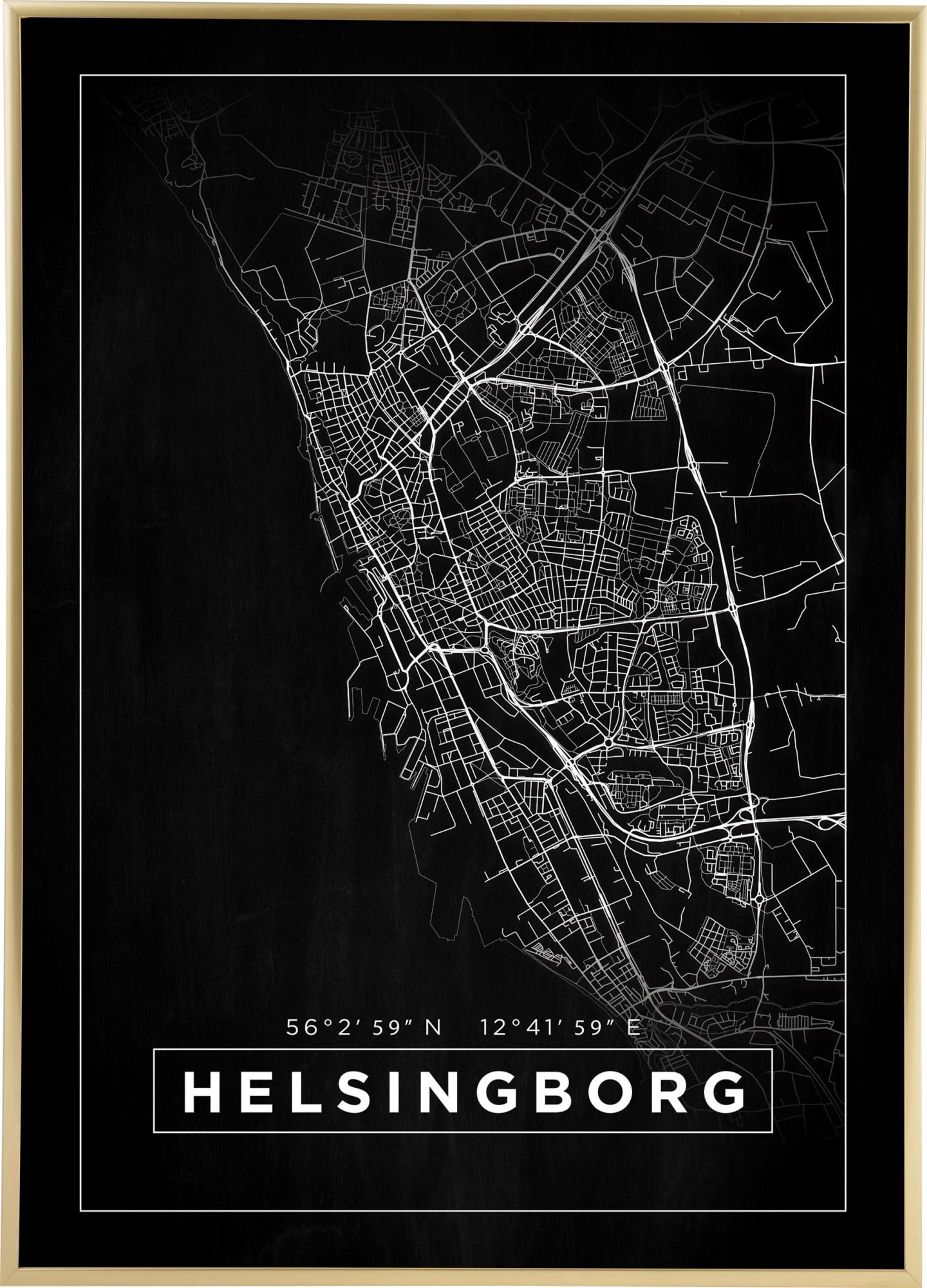 Skaff en kontrastfull poster og gjør veggen mer spennende! Her har vi et skikkelig fint kart over Helsingborg med en svart bakgrunn og hvite linjer. Nedenfor finner du byens navn sammen med dens koordinater. Rundt navnet og langs motivets kanter er det tynne hvite linjer som skaper symmetri. Posteren kompletteres med en fordel med en hvit eller gullfarget ramme fra vårt store utvalg. Ettersom den finnes i flere ulike format finner du like enkelt en som passer å sette på en skjenk som en som kan henge på veggen!
