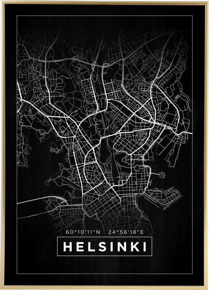 La Helsingfors alle gater utgjøre kunst på din vegg! Dette lekre kartet har byen malt i et stilrent mønster. Under står ”Helsinki” sammen med koordinatene. Motivet kantes av enkle linjer som tilfører symmetri. Velg mellom fargene Svart/hvit, Hvit/Svart og Blå/Gul.