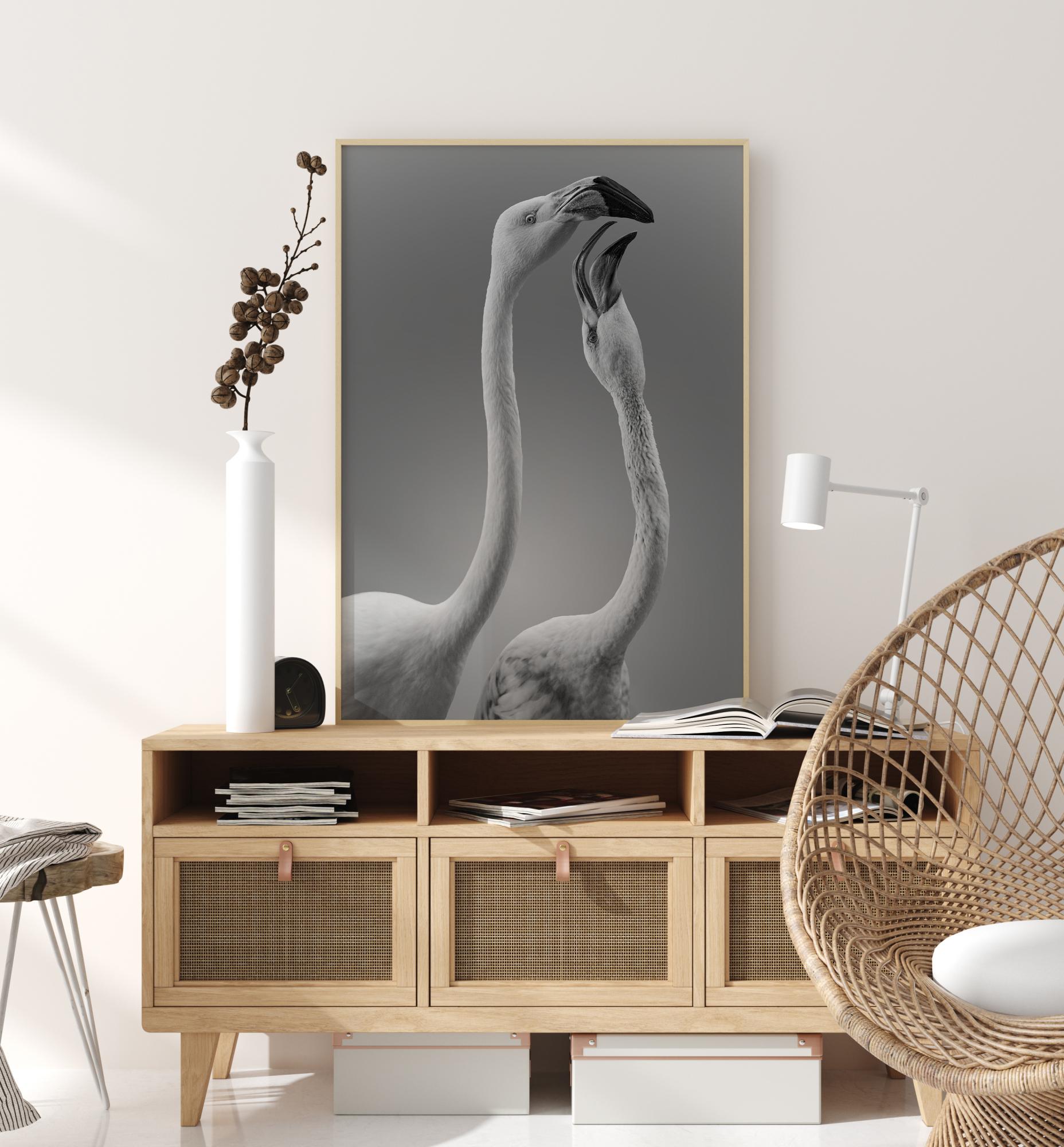 En naturplakat av to flamingoer som lener seg opp i et kyss. De subtile gråtonene i dette svart-hvitt-bildet gir en vakker balanse mot pastellfarger. Føl på roen med disse to fuglene.