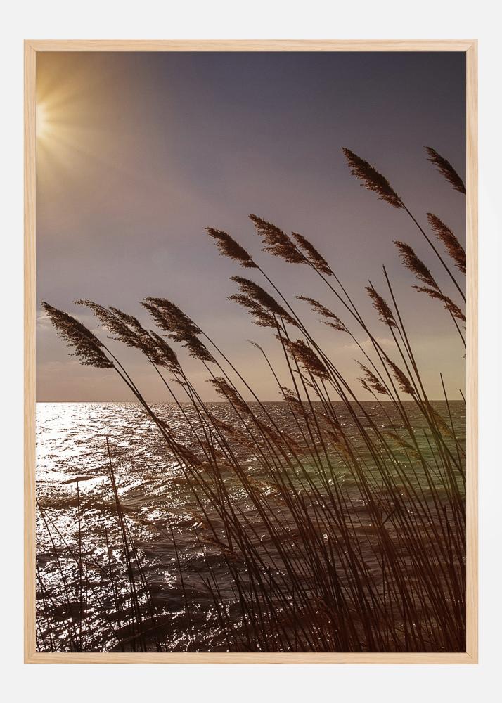 En vakker solnedgang ved vannkanten. Solen skinner på vannet, og de tørre gresstråene blåser forsiktig i vinden. De myke oransje tonene gir en følelse av fred og ro. En plakat som passer perfekt i ethvert rom i huset.