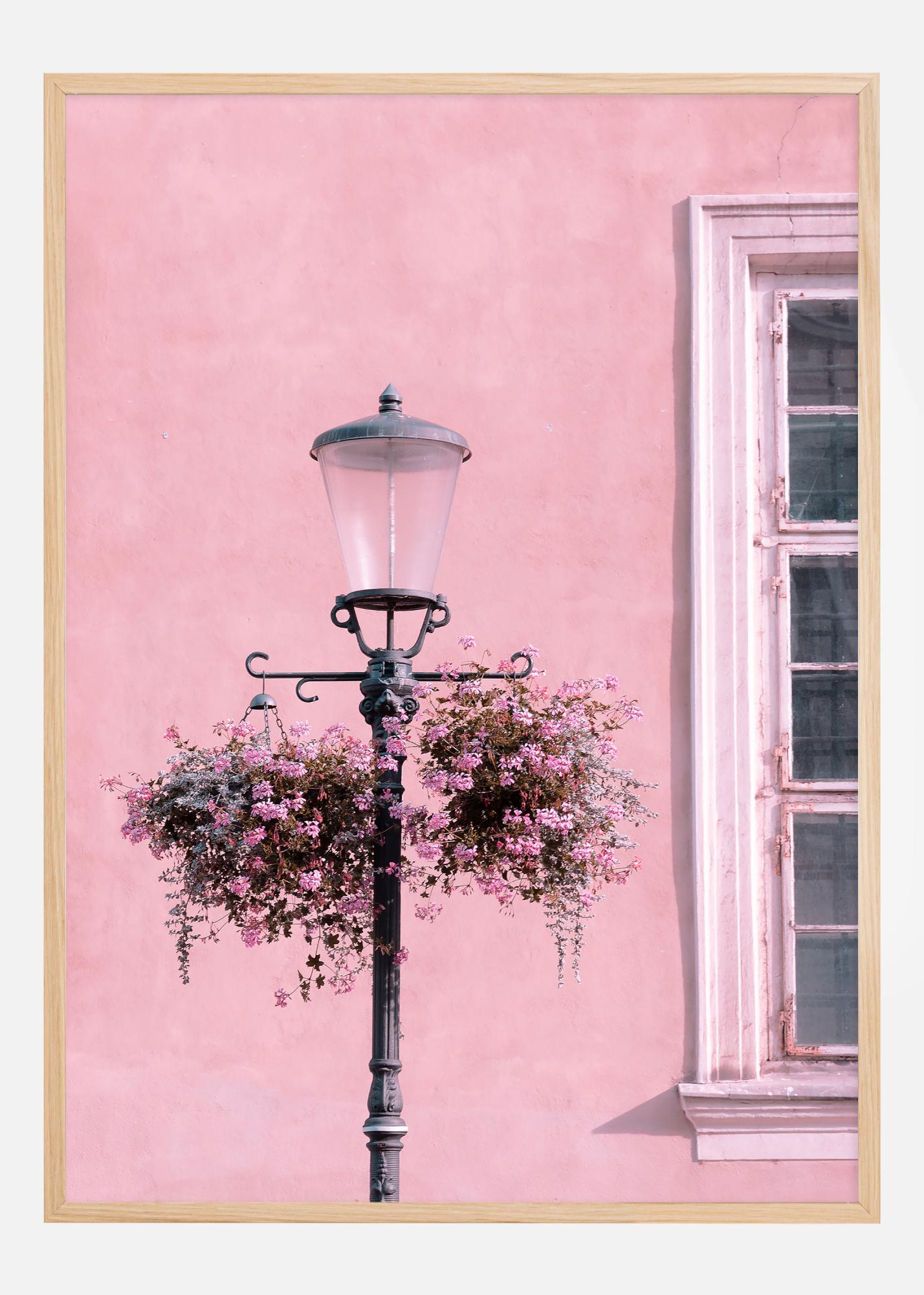 Denne romantiske posteren portretterer en klassisk lyktestolpe pyntet med blomstrende blomsterkasser, mot en vegg i pastellrosa. Det er et bilde som vekker tanker om idylliske bygater og de enkle skjønnhetene i hverdagen. Perfekt for dem som vil ta med seg en bit av det sjarmerende bysentrumet inn i sitt eget hjem. Dette trykket vil lyse opp hvilket som helst sted med sin milde sjarm og vintage-følelse.