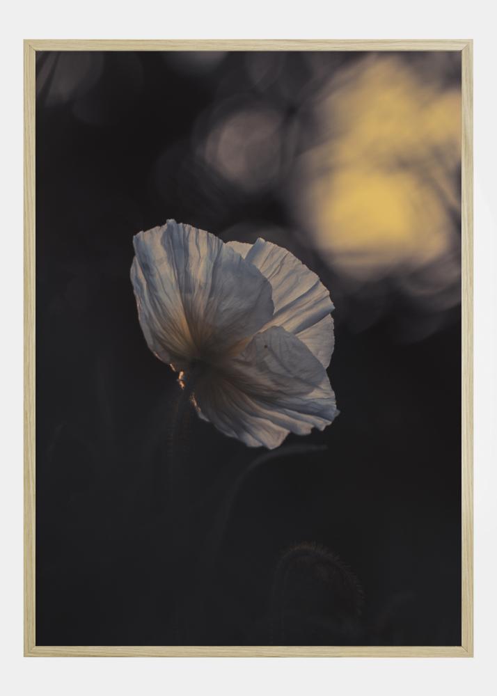 Denne plakaten fanger essensen av en stilleskrivning med en enkel valmue i forgrunnen som belyses av de siste strålene fra en solnedgang. Blomsten er delikat og detaljert, dens kronblad i en lys, nesten gjennomsiktig nyanse av hvit og lyseblått som står i kontrast til den varme, uklare bakgrunnen av solnedgangen i nyanser av oransje og brunt.
