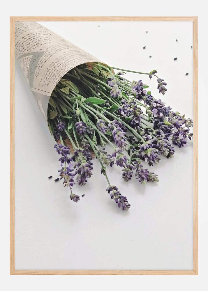 Denne sjarmerende og landlige plakaten fanger essensen av fransk provinsiell estetikk med en bukett av lavendel hvis duft nesten kan føles gjennom bildet. De lilla blomstene ligger vakkert mot en hvit bakgrunn og er elegant innpakket i papir med tekst, hvilket gir en vintage-følelse og minner om en tidlig morgen på et blomstermarked. Dette motivet er perfekt for å gi ethvert rom en følelse av ro og naturlig skjønnhet, samt for å tilføre en romantisk touch til interiøret.