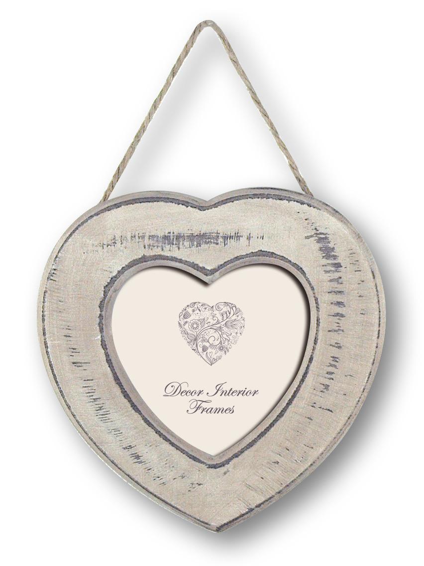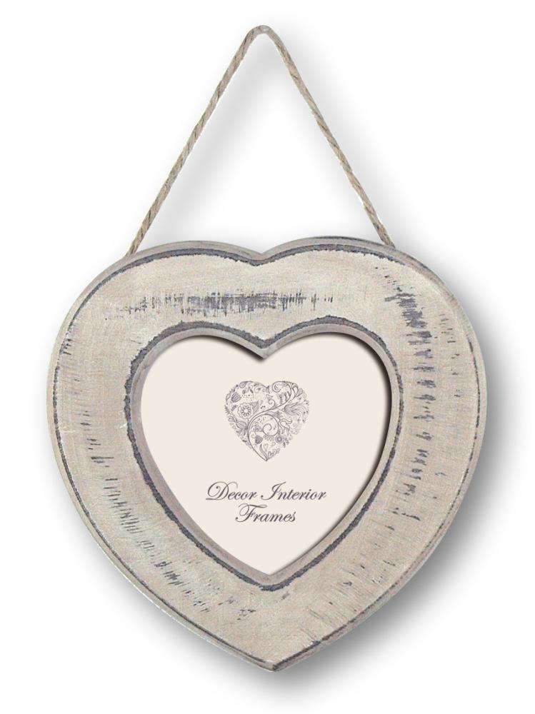 Le Havre er en fin lysegrå, hjerteformet vintageramme ferdig til vegghenging med sitt retroinspirerte hampsnøre.