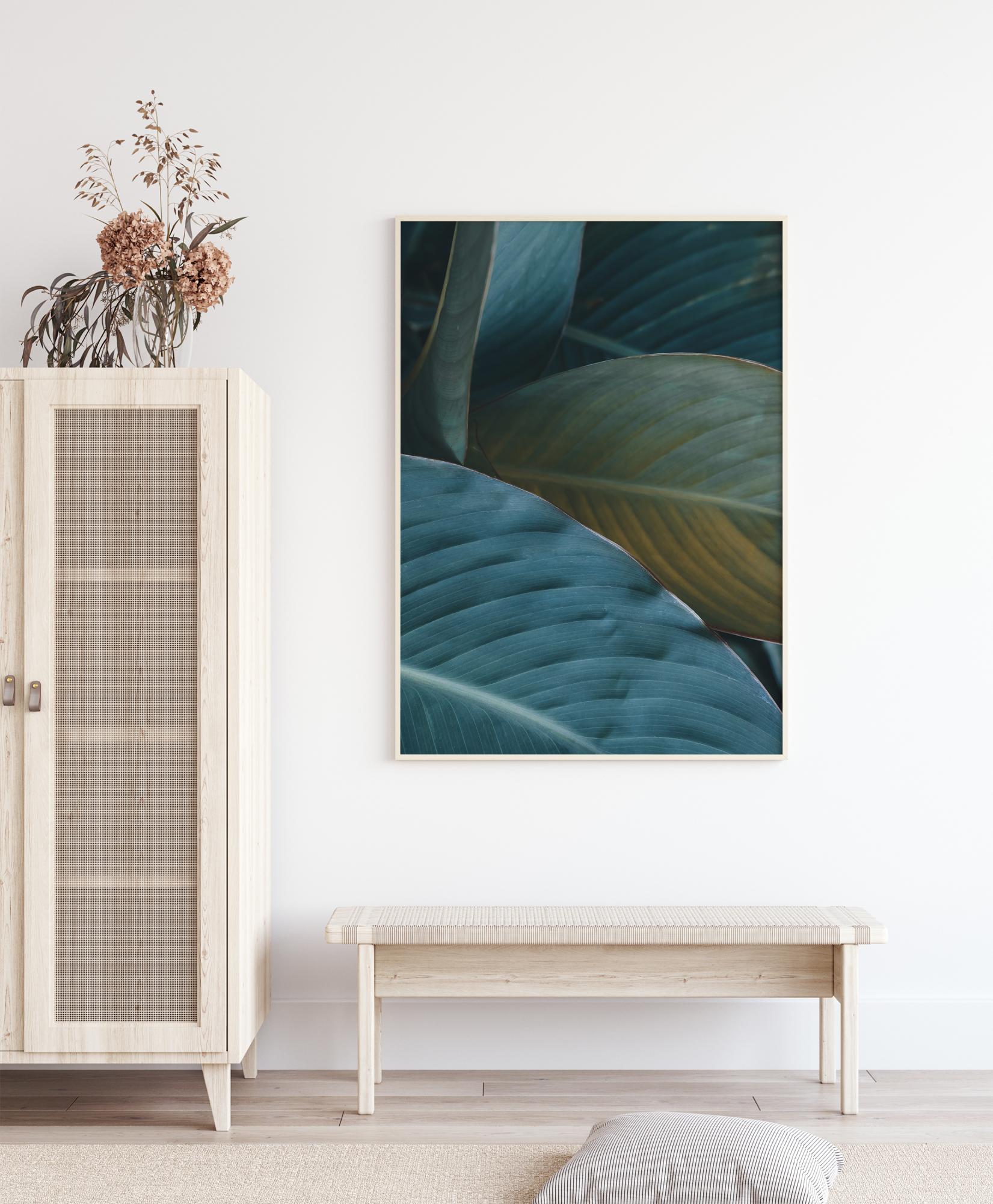 En nærbildeplakat med blader. Enkelheten i denne plakaten reflekteres i de forskjellige tonene av grønt som representeres. Bladene er lysere mot midten, og det naturlige lyset skinner på kantene som gjør at disse ser gylne ut. En vakker plakat å henge i et rom fullt av planter.