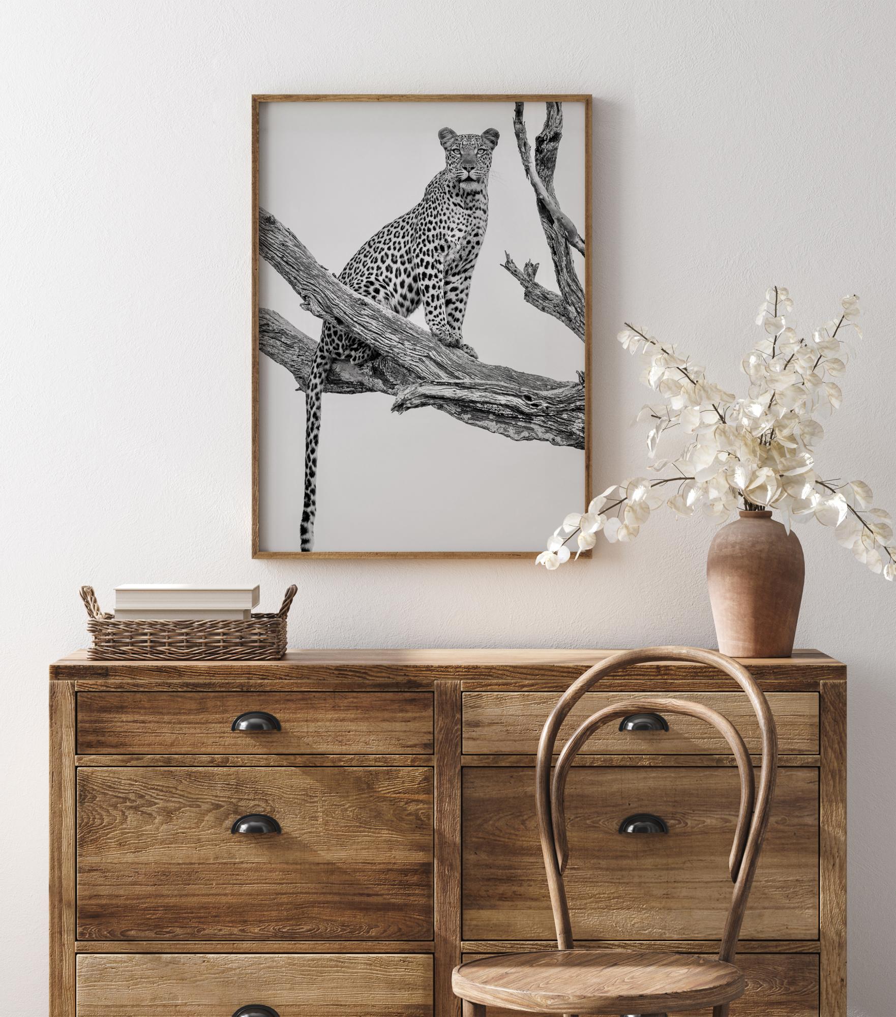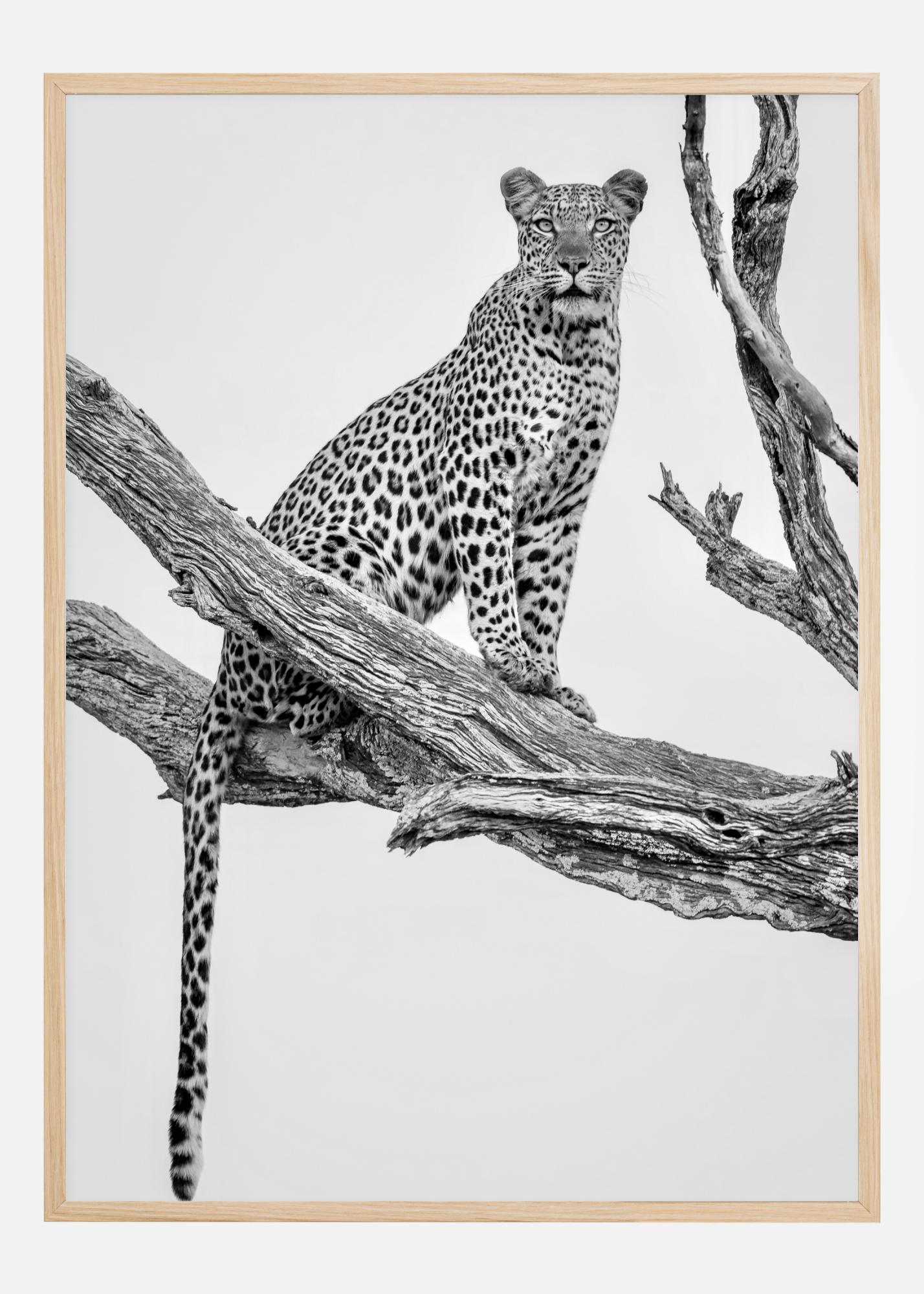 En naturplakat av en leopard som sitter våkent på en enkelt tregrein. Leoparden stirrer ut i det fjerne, og gir en følelse av at noe snart vil skje. Føl forventningen i denne plakaten.