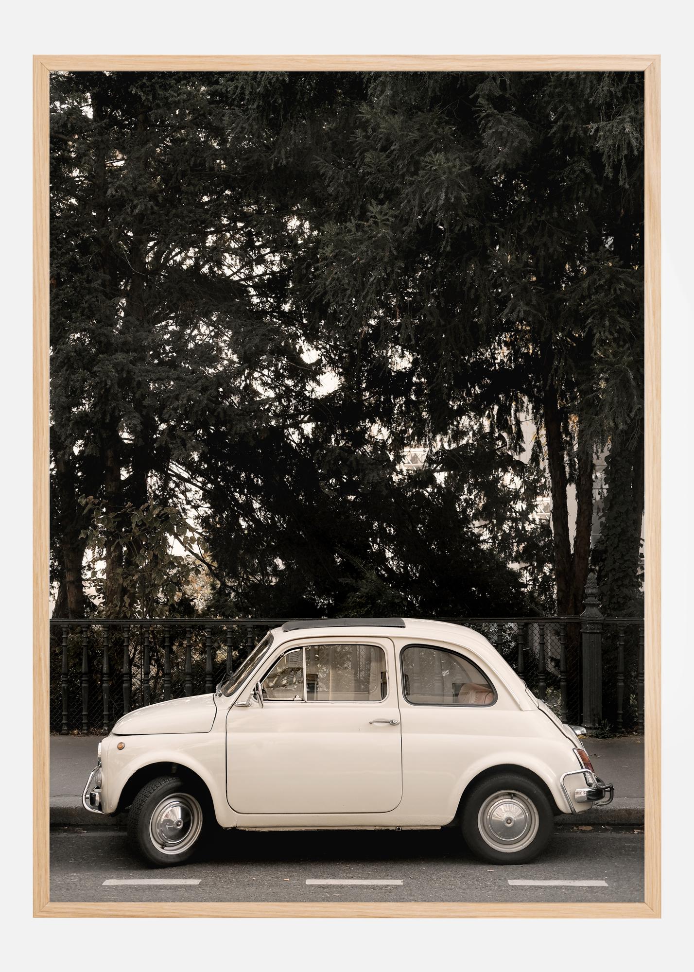I denne posteren gjenspeiles en perfekt balanse mellom bilens rene hvite overflate og de mørkere grønne tonene fra trærne i bakgrunnen, som sammen skaper et rolig og harmonisk bilde. Den sepiafargede himmelen og det subtile bygatermiljøet tilfører en ekstra dimensjon av varme og dybde. Denne plakaten vil tilføre en touch av sofistikasjon til ethvert rom, og er en ideell gave for bilentusiaster eller for de som verdsetter den klassiske estetikken i sin innredning.