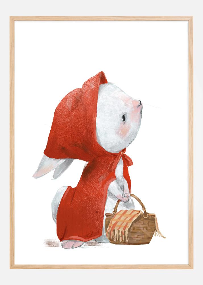Med sin sjarmerende referanse til et elsket folkeeventyr, er denne printen en utmerket interiørdetalj for barnerommet eller som en kreativ touch i en lesekrok. Den røde fargen på kaninens hette er en vakker kontrast mot den ellers nøytrale fargeskalaen og tilfører liv og varme til motivet. Denne plakaten er en forfriskende tolkning av en tidløs fortelling, perfekt for å inspirere til fantasi og kjærlighet til lesing hos de yngre.