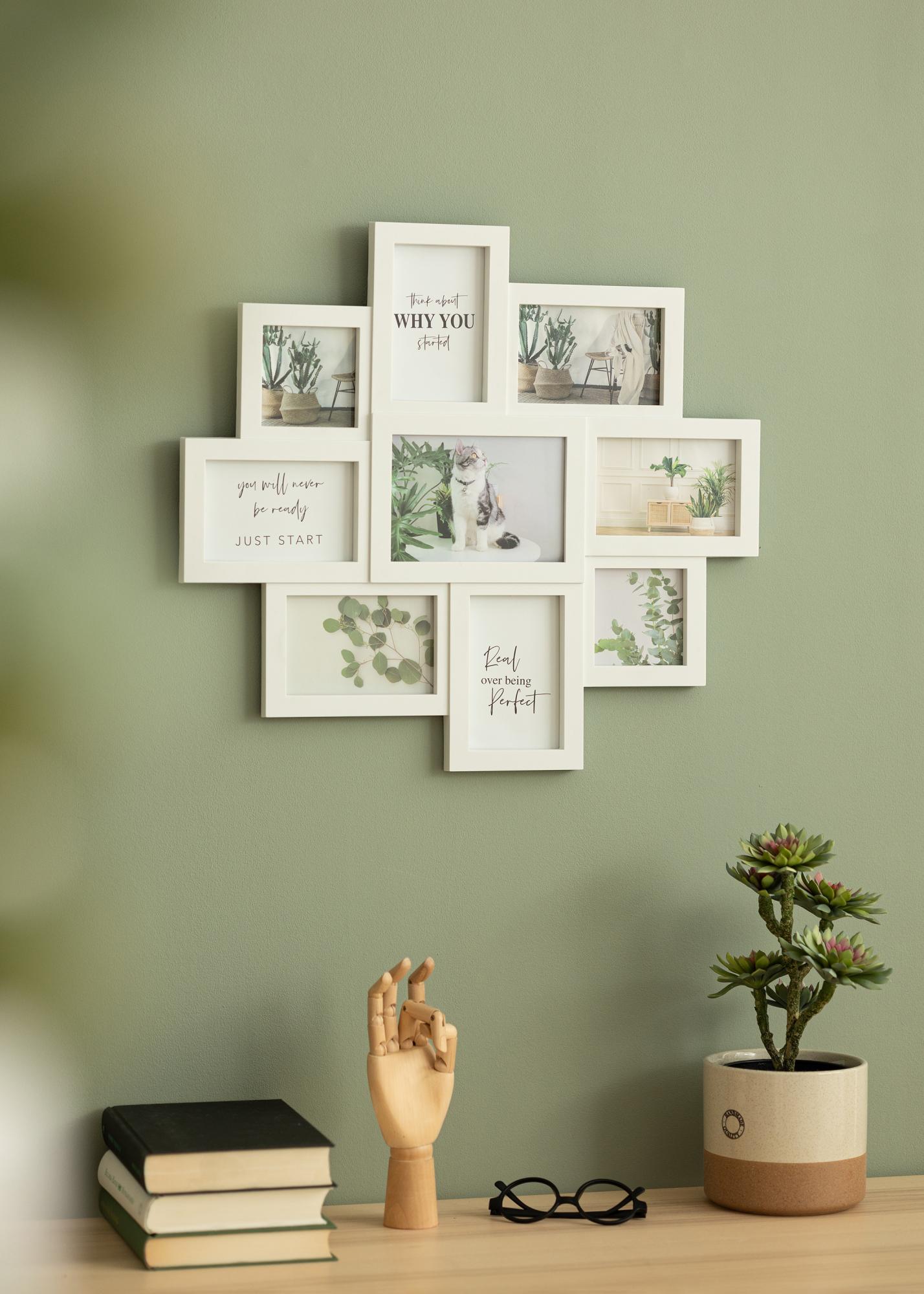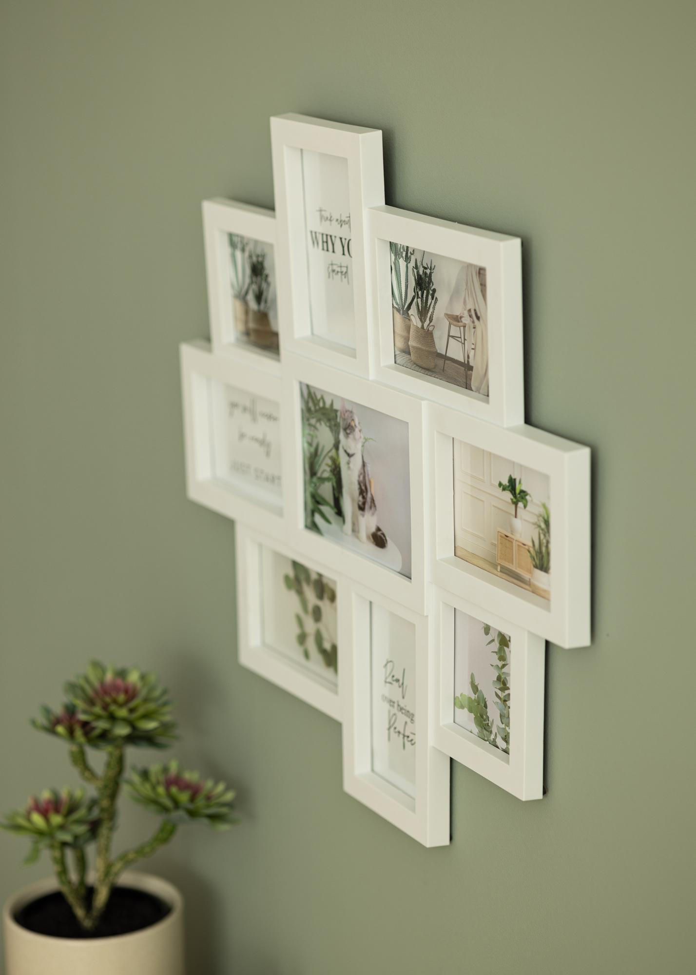 Med denne stilfulle collagerammen kan du samle alle dine favorittbilder i én og samme ramme! Fotorammen rommer totalt 9 bilder; 2 bilder i 10x10 cm, 6 bilder i 10x15 cm og 1 bilde i 13x18 cm. Du kan dessuten plassere inn bilder i både stående og liggende format, noe som lar deg være mer fleksibel i valget av bilder. Rammen har en asymmetrisk form som gir et trendy og moderne uttrykk.