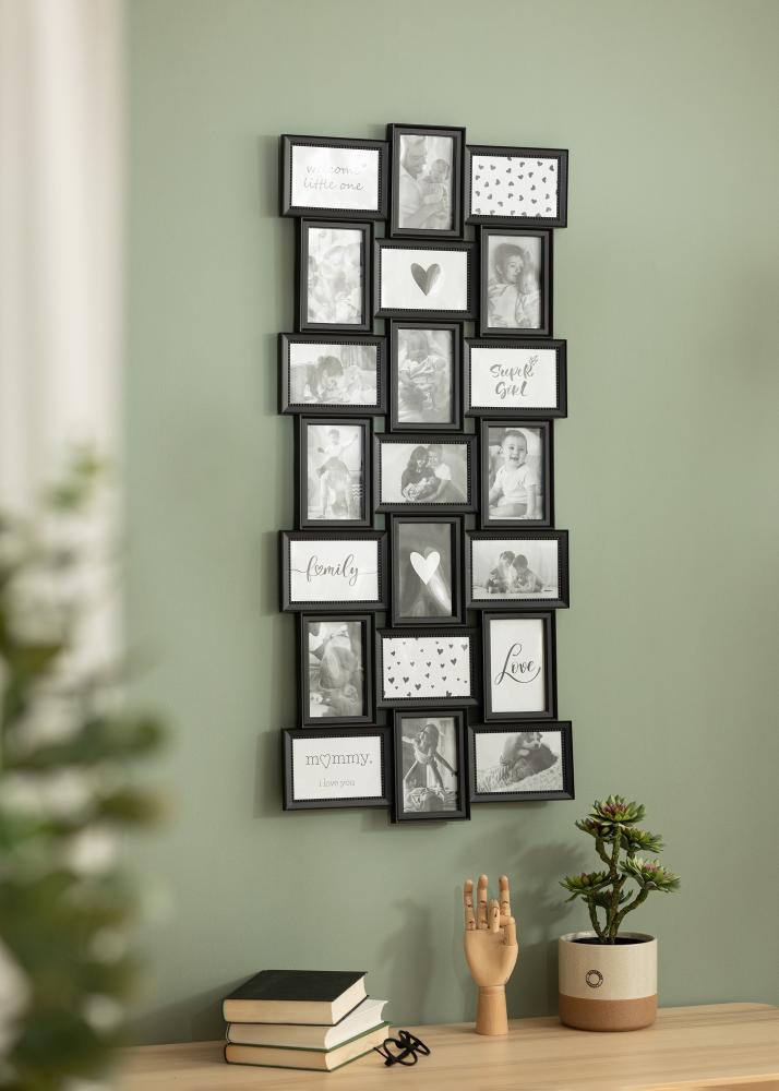 Har du en stor familie hvis mange bilder du ønsker å henge opp på veggen? Da er denne collagerammen et godt valg – den rommer nemlig hele 21 fotografier! Rammen passer for bilder i 10x15 cm og kombinerer bilder i både stående og liggende format. De forskjellige formatene er plassert symmetrisk, noe som gir et svært stilig uttrykk. Du kan selv velge om du vil montere rammen i vertikal eller horisontal posisjon.