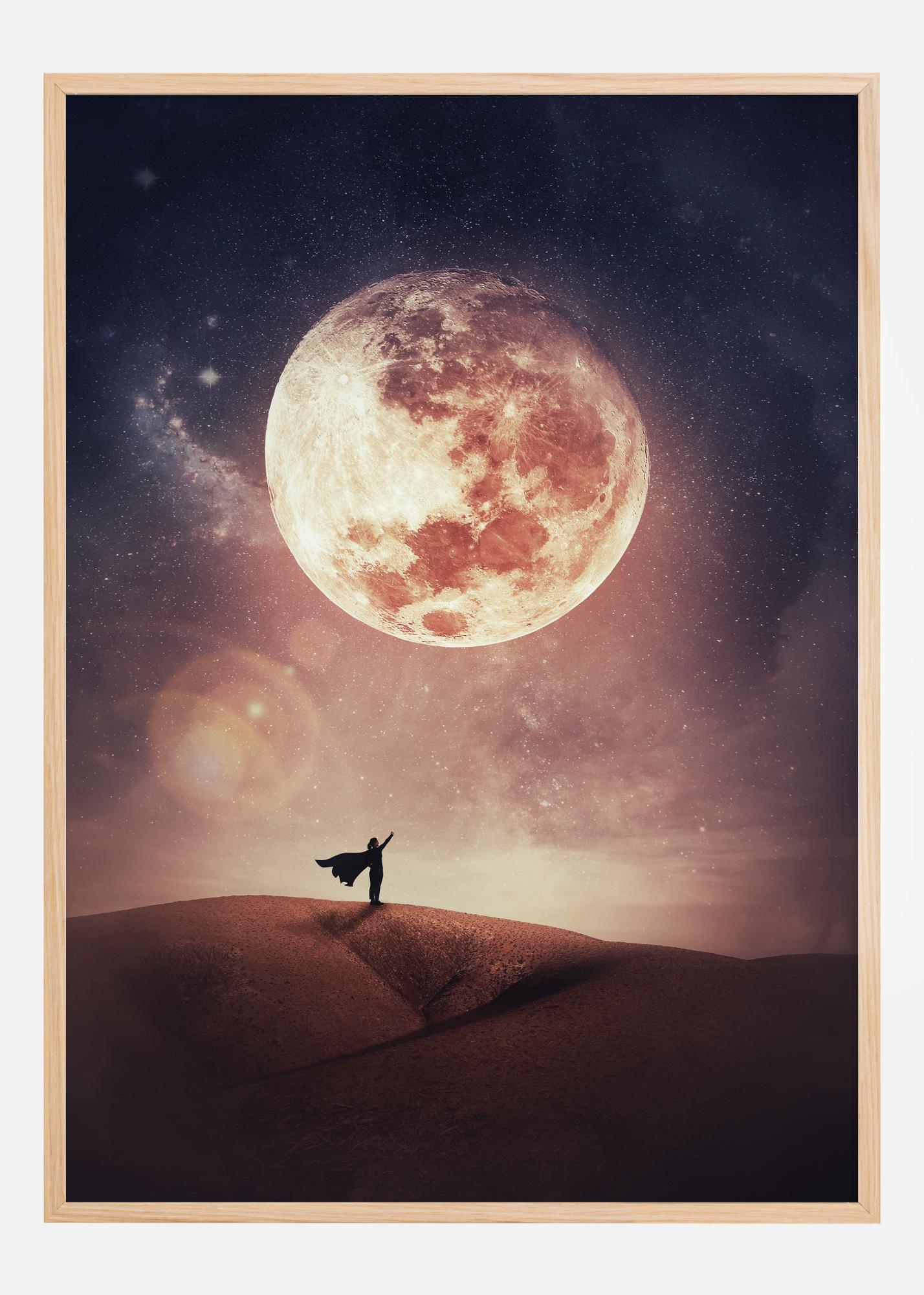 Denne drømmelignende posteren fanger et magisk øyeblikk der en ensom figur står på en ørkenbakke og ser opp mot en enorm, strålende måne omgitt av en stjernefylt himmel. Scenen er en sterk påminnelse om vår plass i universet, både ubetydelig og forunderlig. Den vekker følelser av lengsel og nysgjerrighet, inspirerer oss til å tenke stort og å drømme uten grenser.