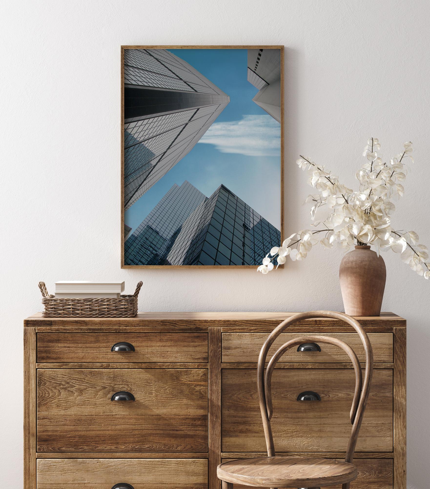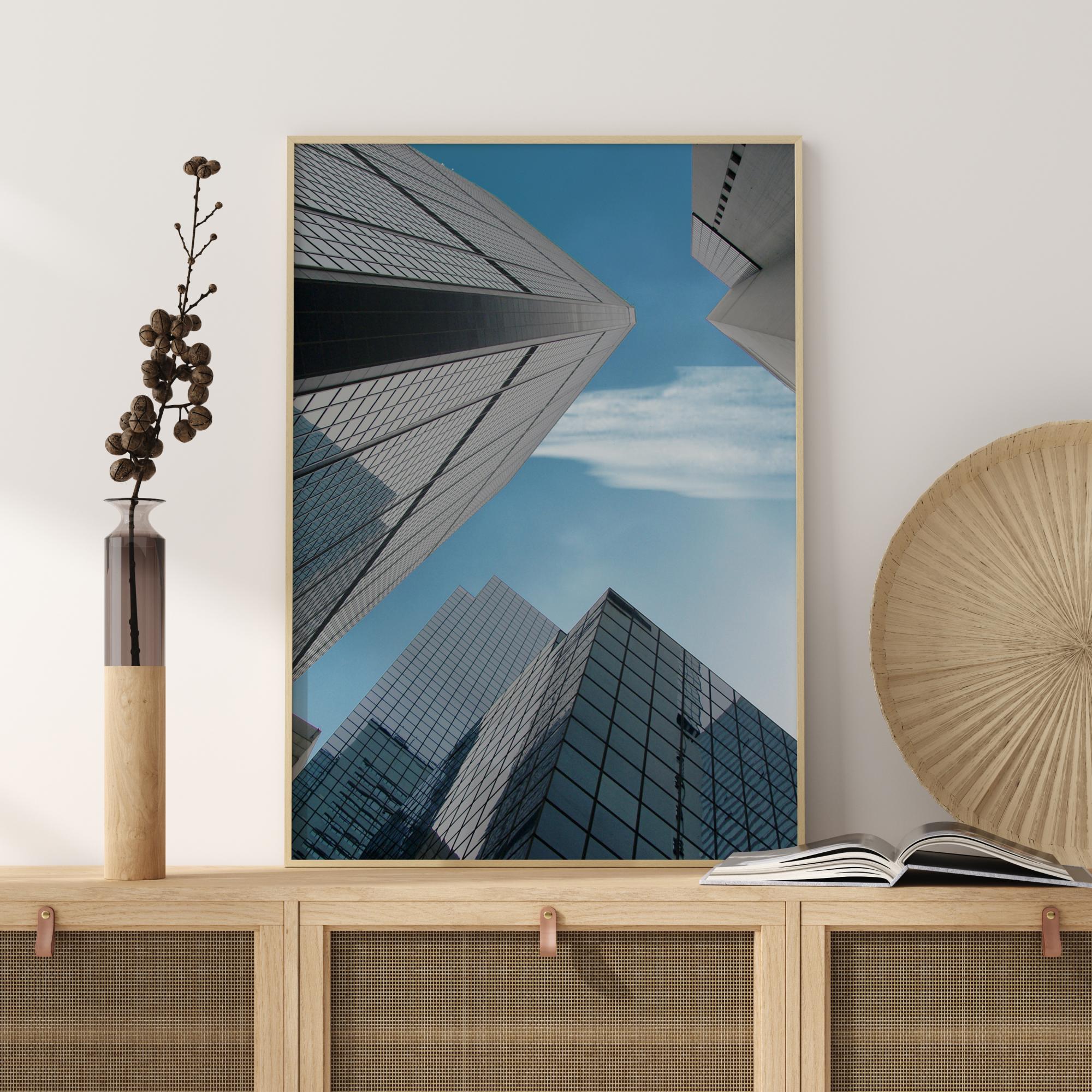 En fantastisk arkitektonisk plakat av bygninger med speilpanel. Tatt fra et opp-ned-perspektiv, gir denne plakaten en følelse av storhet. Den vakre, lyseblå himmelen med en enkelt hvit sky tilfører et ekstra snev av farge til denne vakre plakaten. Perfekt i små omgivelser for å legge til en følelse av uendelighet til et lite rom.