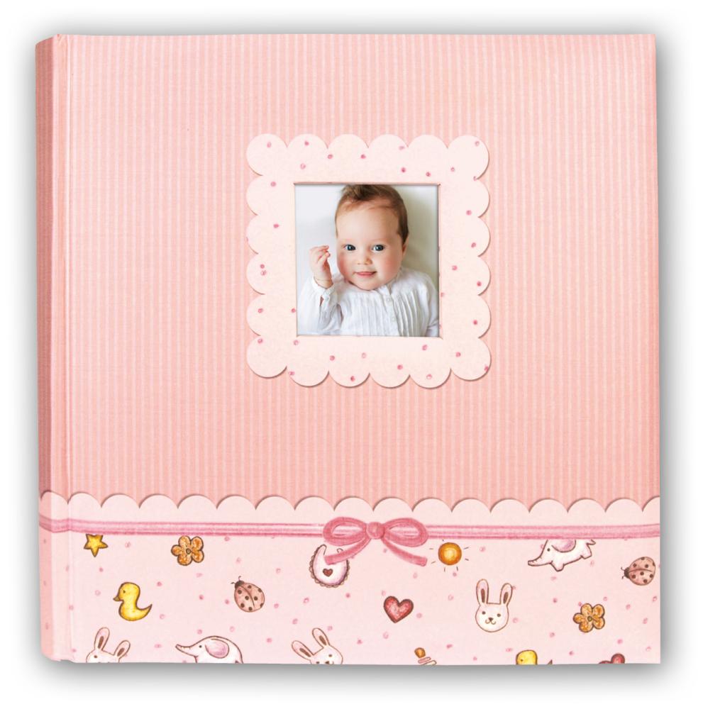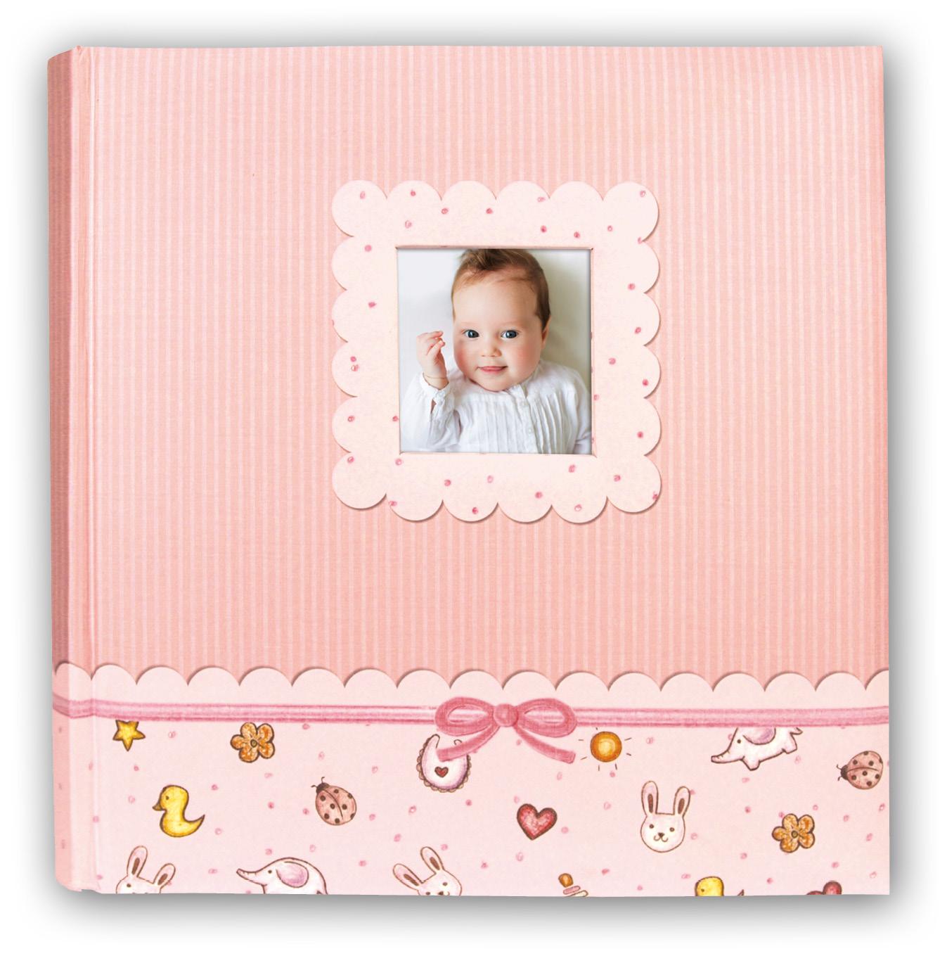 Søt rosa babyalbum med plass til ditt eget bilde på forsiden av albumet. Albumets permer er stripete og fylt nederst med søte små symboler