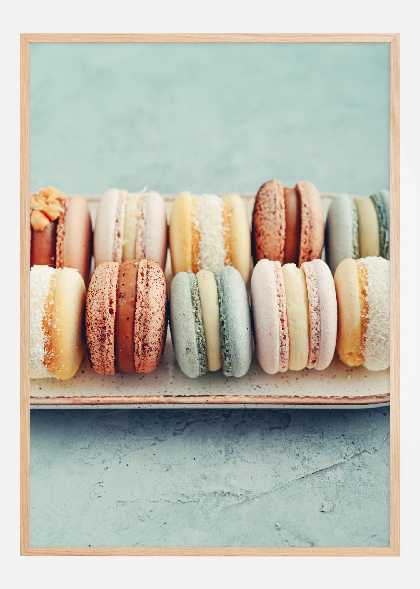Denne fargerike og appetittvekkende posteren fremstiller en rekke delikat ordnede makroner, hvis varierte farger og teksturer skaper en visuell fest. De myke pastellfargene spenner fra blek sitron til rik karamell og pudderaktig rosa, hver makron er fremhevet med detaljer som strøssel og kokosflak, noe som forbedrer dens utseende og antatte smak.